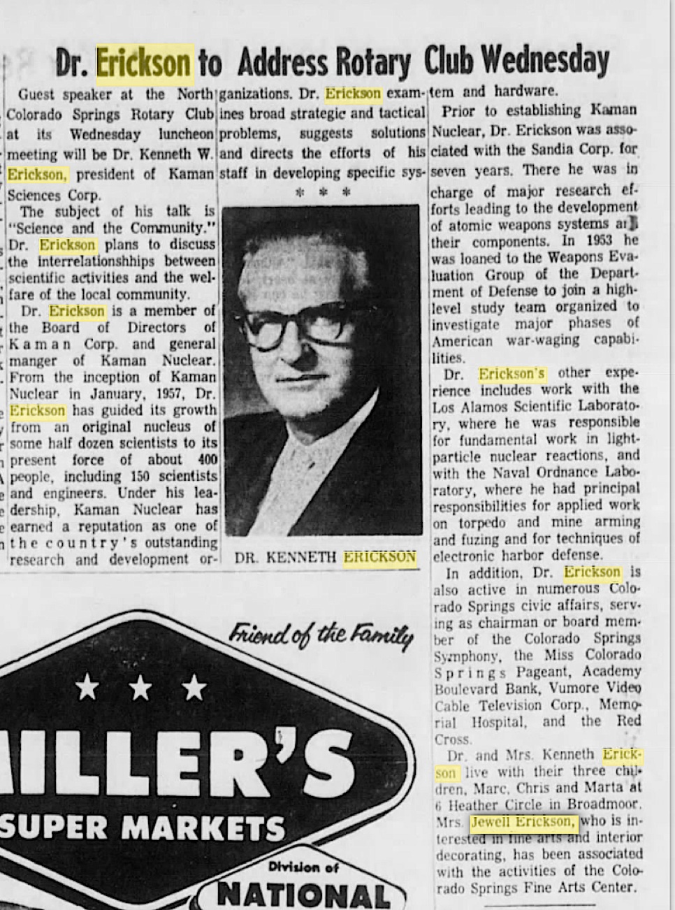 In 1968, Mr. Erickson was elected president of Kaman Sciences Corp. and the next year was named assistant provost of UCCS.