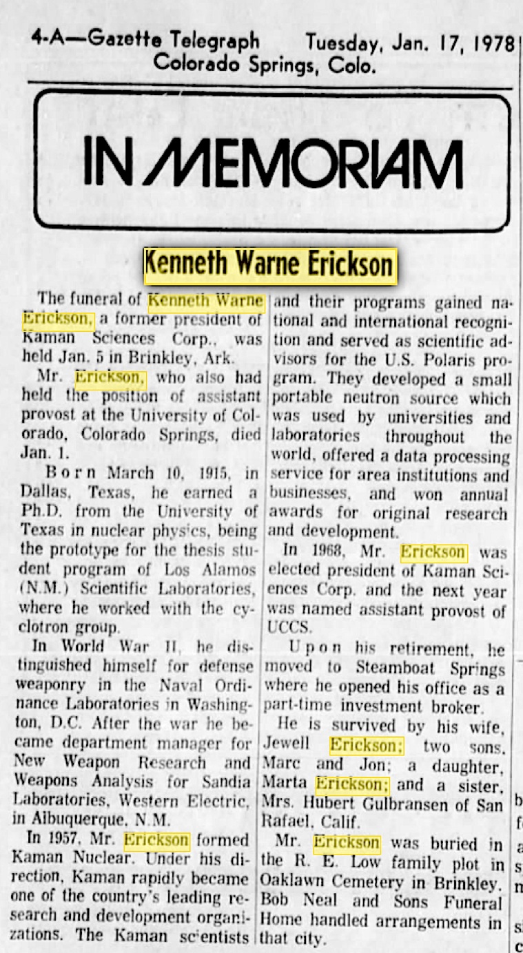The funeral of Kenneth Warne Erickson, a former president of Kaman Sciences Corp., was held Jan. 5, in Brinkley, Ark.