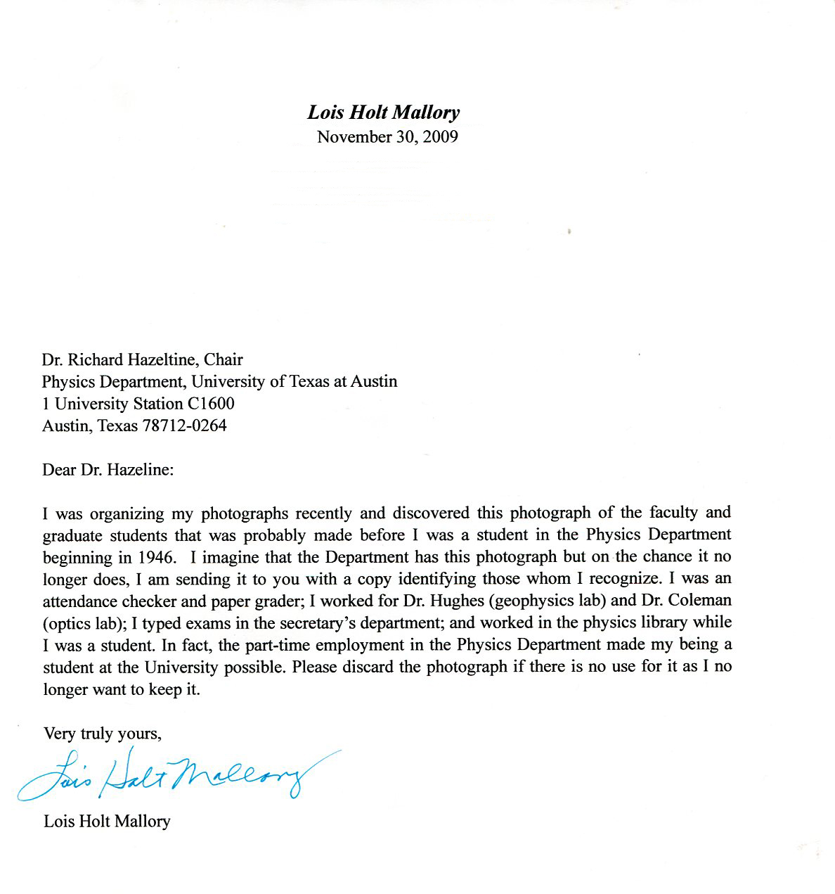 Letter from Lois Mallory to the chair of the University of Texas Physics Department that was the beginnings of the UT Physics Department History site. The photograph that accompanied it is here: 1946 Sigma Pi Sigma photo.