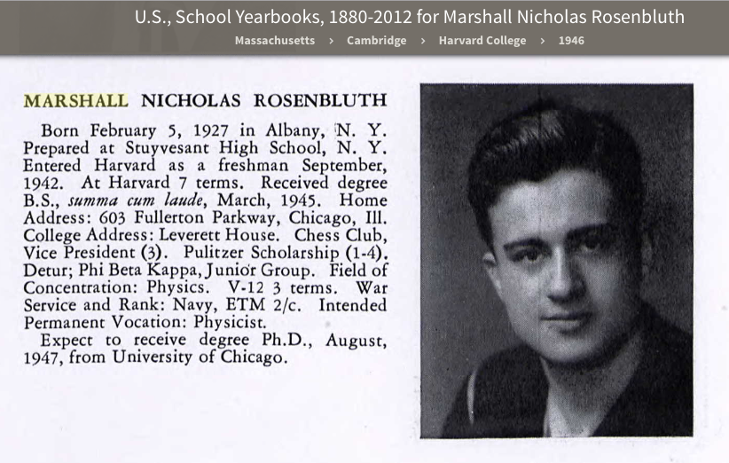 Born in Albany, Marshall Nicholas Rosenbluth graduated from Harvard in 1946 and went to graduate school in physics at the University of Chicago, where many of his teachers had recently helped to invent the atomic bomb.