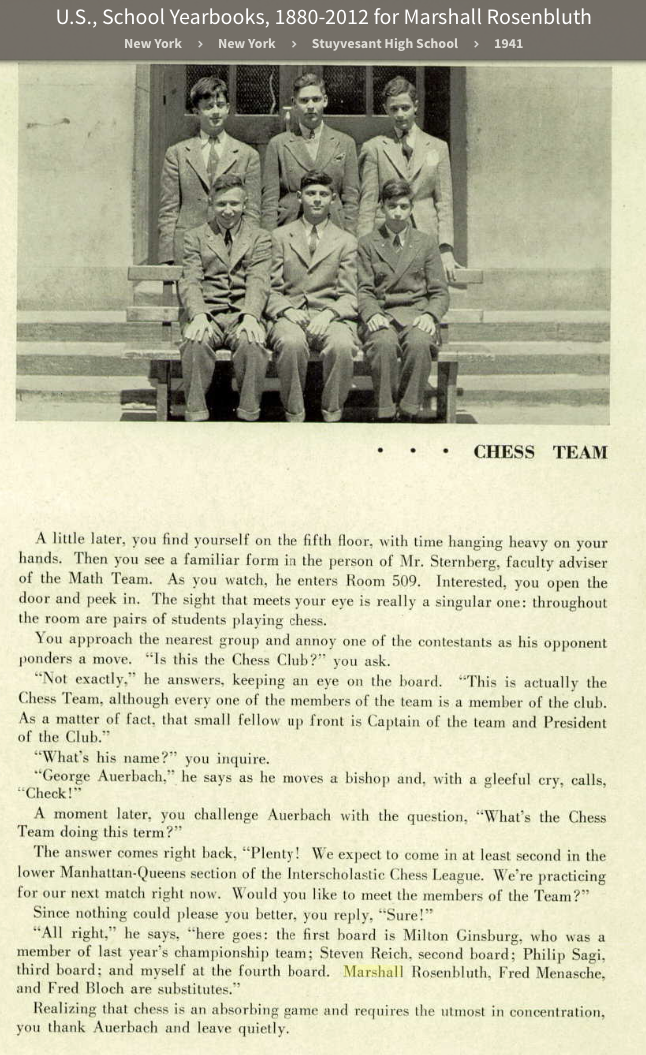 Marshall N. Rosenbluth was born in Albany, New York, February 5, 1927 to Robert (1887–1975) and Margaret Sondheim (1896–1960) Rosenbluth. His brother was Lehman C. Rosenbluth, (1930–1992). who was a graduate of New York Community College of Applied Arts and Sciences in Brooklyn, NY. He became an accountant in Chicago. He married Lois Collins in Bensenville, Illinois, USA, November 15, 1958 according to Presbyterian Church records. A civil ceremony may have taken place in Chicago on October 25, 1958.
