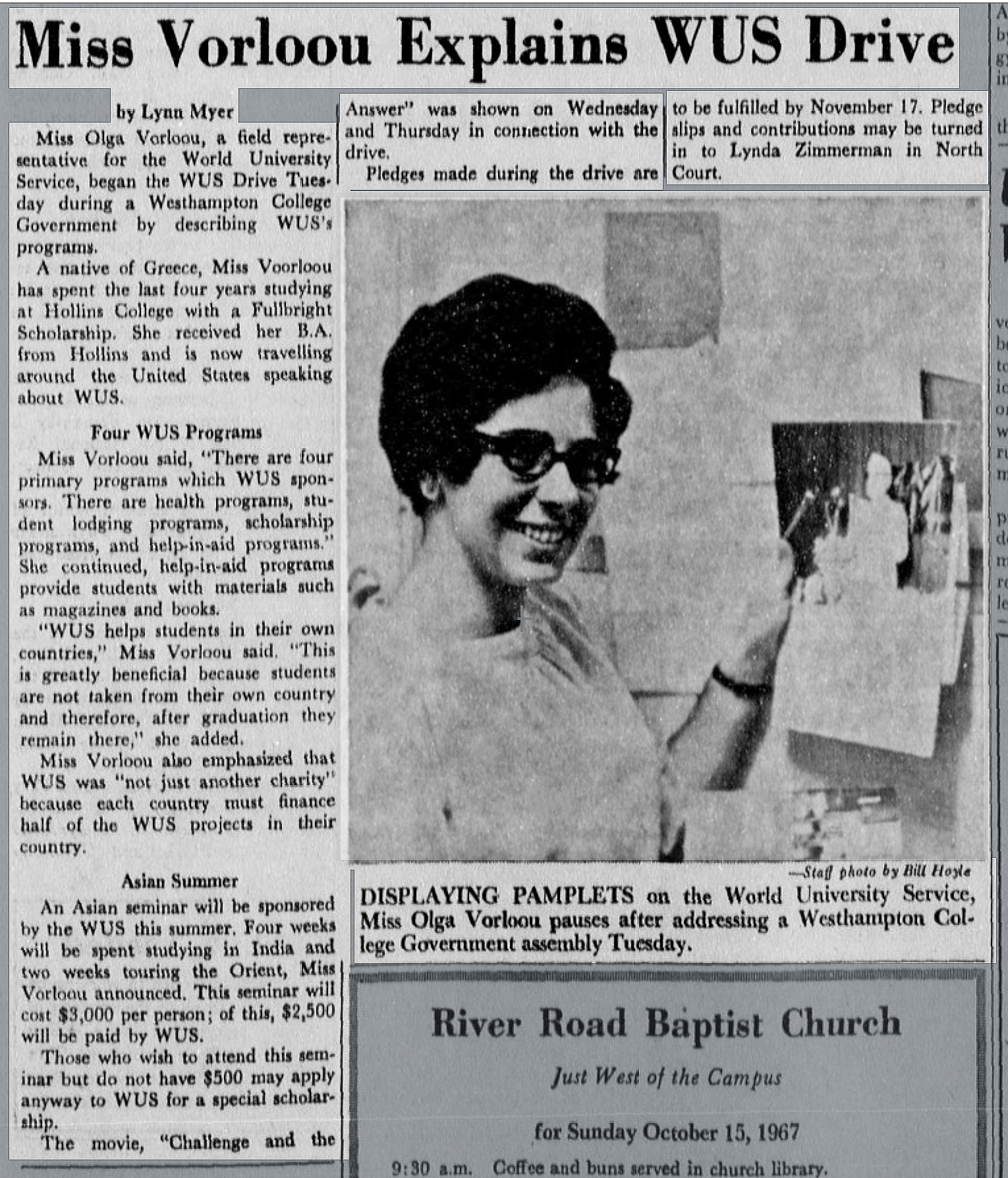 In August, 1963, I competed and got a Fulbright scholarship and came to the U.S. to study English for a year. I thought I was coming for a year only. However, my scholarship got renewed for three more years (one at a time) and I got my B.A. in Philosophy & Religion in May of 1967. (At graduation, Olga was the recipient of the Algernon Sydney Sullivan Award which recognizes members of the campus community who have shown by daily living those qualities emblematic of a spirit of love and helpfulness to other men and women. Seventy colleges and universities in the South give the award.)