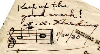 Musical autograph of Harding shown at right. Robert Winter writes, “From about 1790 to 1950 it was common (though by no means mandatory—especially by 1930) for both performers and composers to include a small musical inscription. About half the time these are little nothings that are unrelated to any actual composition. This is almost certainly the case with the 3-note inscription by A.R. Harding.”