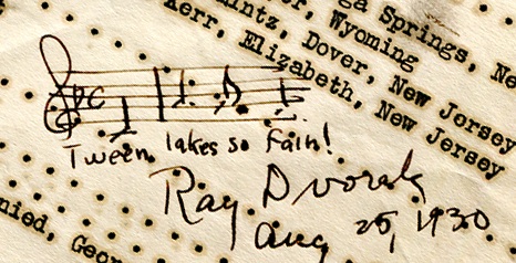 The musical autograph of Dvorak is shown at right. The reference to “Tween lakes so fain!”, of course, refers to the location of the Interlochen Camp between Green Lake and Duck Lake. Robert Winter writes, “Dvorak’s is either the incipit of an art song or—more likely—a quick homage to Interlochen’s location.”