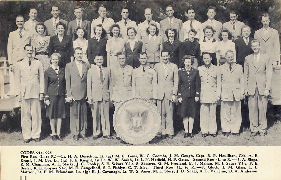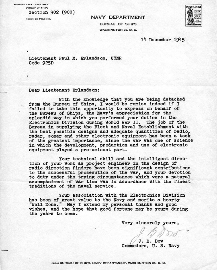 Here is a photo from the Bureau of Ships Yearbook 1945. Shown is an Electronics Group at the Bureau. Lt. Erlandson is fourth from left on back row.