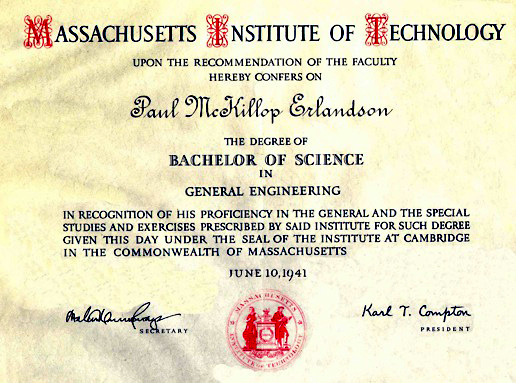 On May 29, 1939, he received an amateur radio station license; his call letters were “W 1 M C E”. The base station location was MIT dormitories. He earned a BS degree in 1941. Karl Taylor Compton, whose signature appears as president on his diploma, was a prominent American physicist and president of the Massachusetts Institute of Technology from 1930 to 1948.