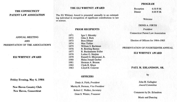 The Eli Whitney award is presented by the Connecticut Intellectual Property Law Association to an outstanding individual in recognition of significant contribution to law or science. Paul M. Erlandson won the award in 1984. The list of prior recipients demonstrates the high regard he garnered among industrial scientists and engineers.