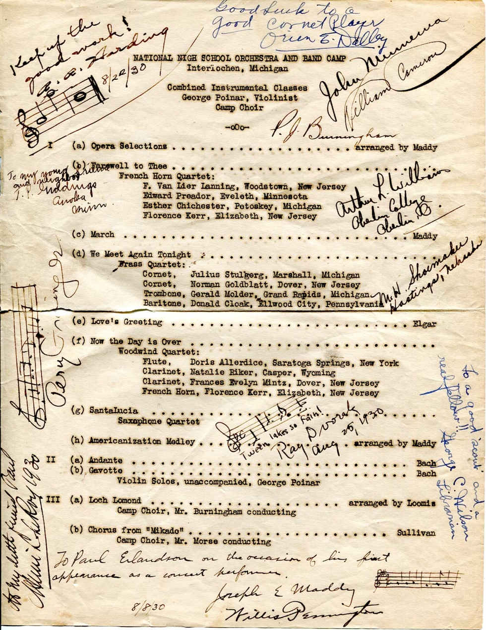 Joseph E. Maddy. Signature at bottom of program. He was born in Wellington, Kansas where both of his parents were teachers. He attended Wichita College of Music in Wichita, Kansas where he studied violin and later joined the Minneapolis Symphony Orchestra. He was also the first music supervisor of instrumental music in America in 1918 in Rochester, New York. After a short time in Rochester, he was encouraged by Will Earhart to take a job at Morton High School in Richmond, Indiana to revive the outstanding school and community music program Earhart had developed there some years earlier. He remained in Richmond for four years.
