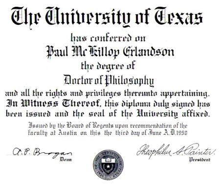 Erlandson attended UT from March 1946 to June 1950. He earned master’s in January 1949, with a thesis entitled, Photo-Electronic Synthesis of Musical Tones. Amazingly, he completed his PhD in 1950, the title was, Photo-electronic Voltage Generation. His PhD supervisor was Professor Robert B. Watson. The dissertation addressed the storage of information, a very advanced topic for this time. He was exceptionally versed in electronics. The work was done while employed by the Defense Research Laboratory. Both Watson and Claude Horton, in their roles as Research Scientists at DRL, signed off on the research, approving Erlandson’s request to Director C. P. Boner, to present the work as a dissertation.