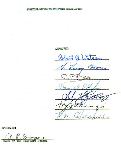 Paul Erlandson’s career demonstrates the versatility of a physics education. Armed with a brilliant mind, a Midwestern work ethic, an insatiable curiosity, and recognized organizational and administrative skills, he made major contributions across a spectrum of physics and engineering. The ease with which he moved between physics areas and his ability to use his physics to impact technology in a major way is truly impressive. We see his technology prescience and savvy in his choice of a dissertation topic, “information storage.” Remember, this was 1950, and here he was addressing many of the issues that would explode a generation later. With typical physicist’s understatement, he entitled his work, Photoelectronic Voltage Generation. The breadth of knowledge revealed in this dissertation would suggest a person destined for a distinguished career. As the material below demonstrates, that conclusion would have been, “spot on.”