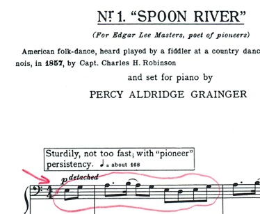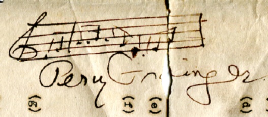 Grainger’s musical autograph is shown at left. Robert Winter writes, “The Grainger incipit is the first measure (with two eighth-note upbeat and transposed up an octave) of his solo piano composition, "Spoon River," composed in 1919 and published in 1922. The piece is part of "American Folk-Music Settings." Grainger was always eager to point up his American loyalties, having already served as a US Army bandsman in World War One.