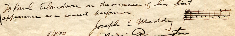 Below is the musical autograph of Maddy. He included two bars of “My Country, ‘Tis of Thee”. Robert Winter wrote, “It was common in the late nineteenth and twentieth centuries to give incipits of patriotic songs—an outgrowth of the European/American promotion of the "nation-state" in which American power was (after 1892) quietly pointed up by such an incipit.”