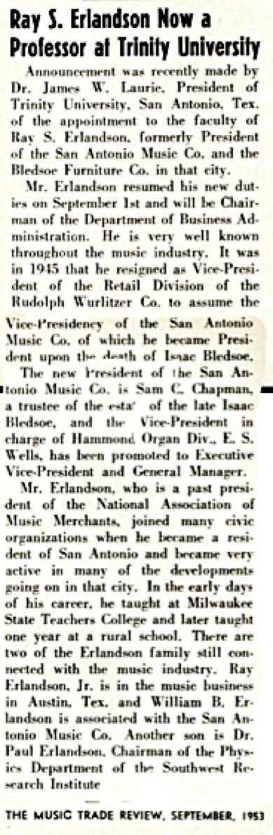 Paul Erlandson was born in Washington, DC, on October 27, 1920 to Ray Sanford (1893–1991) and Margery Ann McKillop Erlandson (1894–1981). Ray’s parents were born in Norway and Margery’s parents were from Canada. While doing graduate work Ray served as secretary for an Educational Association in DC. He and Margery were lodgers in a large house in Columbia Heights in 1920. Ray earned a master’s from George Washington University in 1922. His thesis was entitled, Tenure. Margery worked as a music teacher. Ray next served as Vice President of the Rudolph Wurlitzer Co. in Cincinnati before accepting a position in San Antonio as Vice President and General manager of San Antonio Music Co. and Mission School of Music. Paul’s brother Ray worked as a salesman in the company. Ray became chair of Business Administration at Trinity University in San Antonio, TX. He wrote a book, Starting and managing a small retail music store, (The Starting and Managing series).