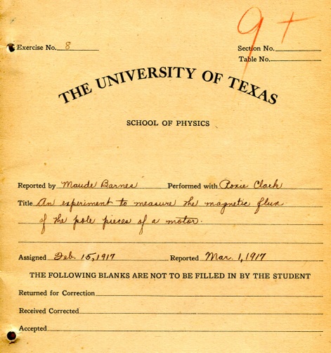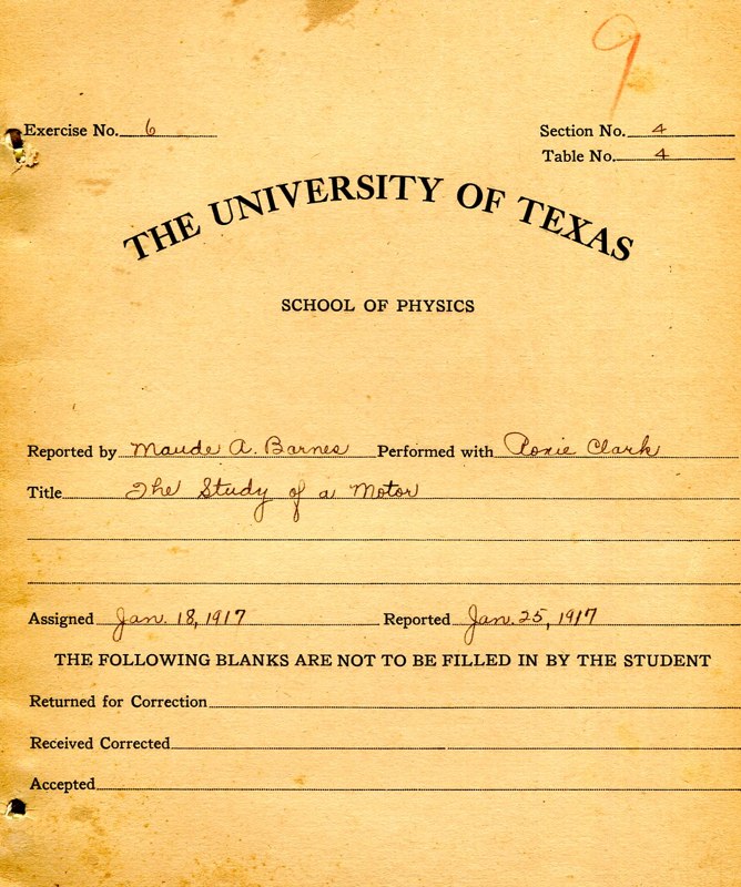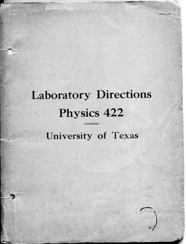 Jon Scott Bender, a UT graduate, was attending an estate sale in Dallas, Texas when he spied a UT Physics Laboratory Manuel for Physics 422 and a number of associated lab reports. While not a physics major, Jon’s appreciation of history and loyalty to his alma mater motivated him to buy the documents. He found this physics history web site contacted me, and offer to give these items to the department. I very much appreciate his thoughtfulness.