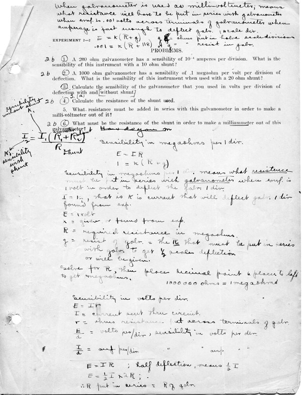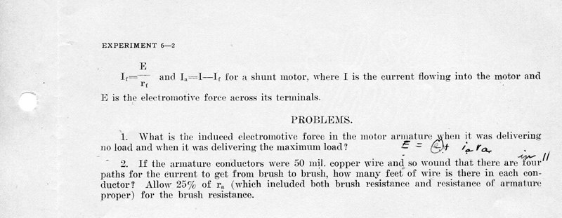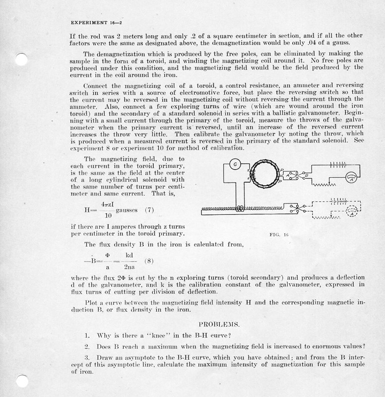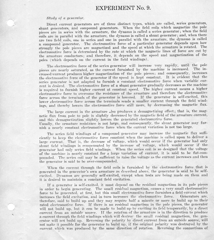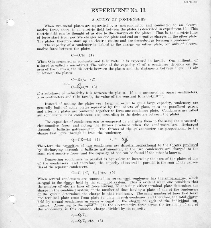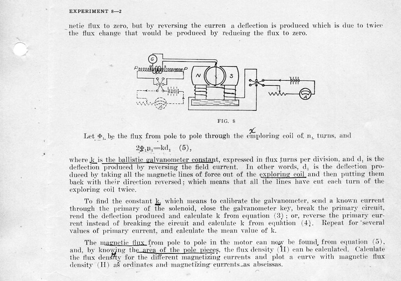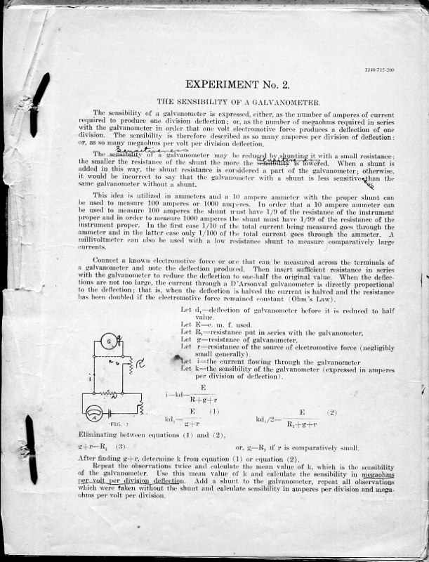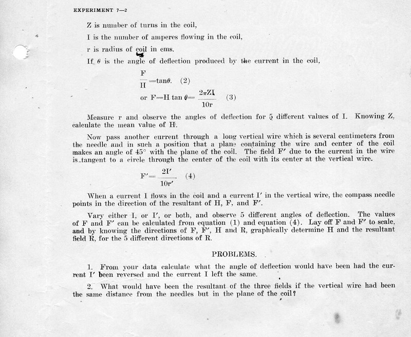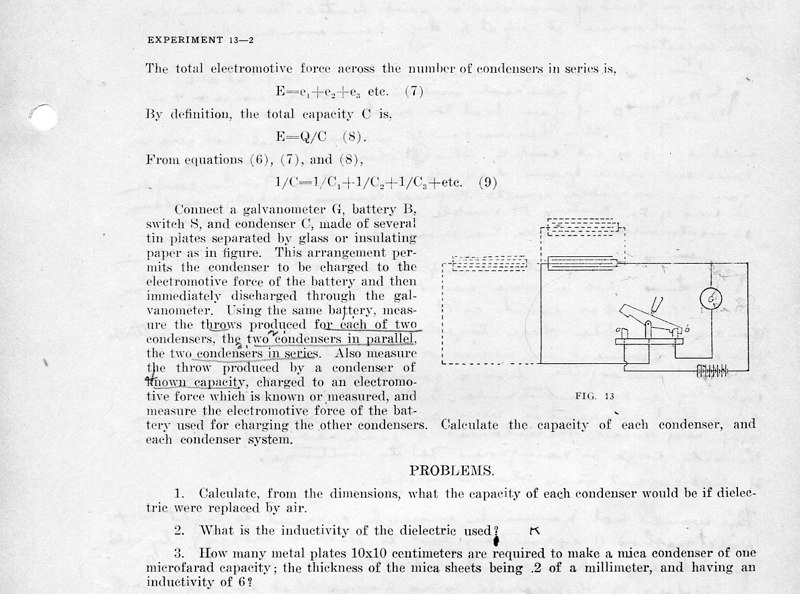 The course Physics 42,2 was an upper division course entitled, Magnetism, Electricity, Light and Sound. The lecture met for three hours each week and the laboratory also was a three-hour session. Prerequisites: Mathematics 1 (This was an applied mathematics course for engineering students, there was also a Department of Pure Mathematics at this time.) Physics 1—General Physics or Physics 38—Mechanics and Heat. Lecture was in K Hall and laboratory was in the Main Building. It must have been a popular course, since, in 1921, eight sections were listed.