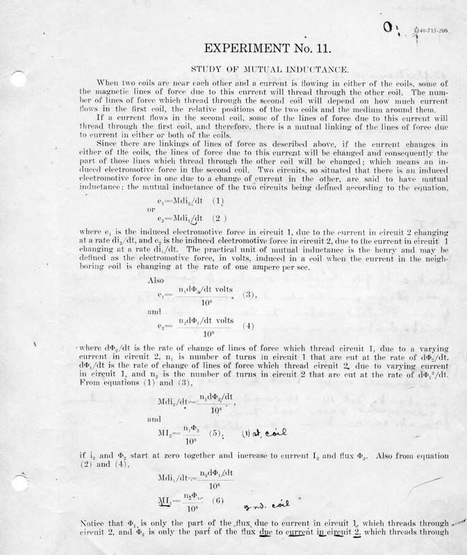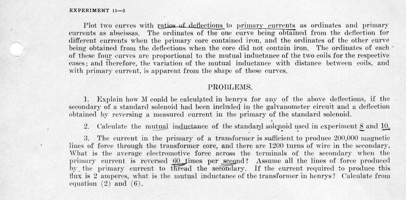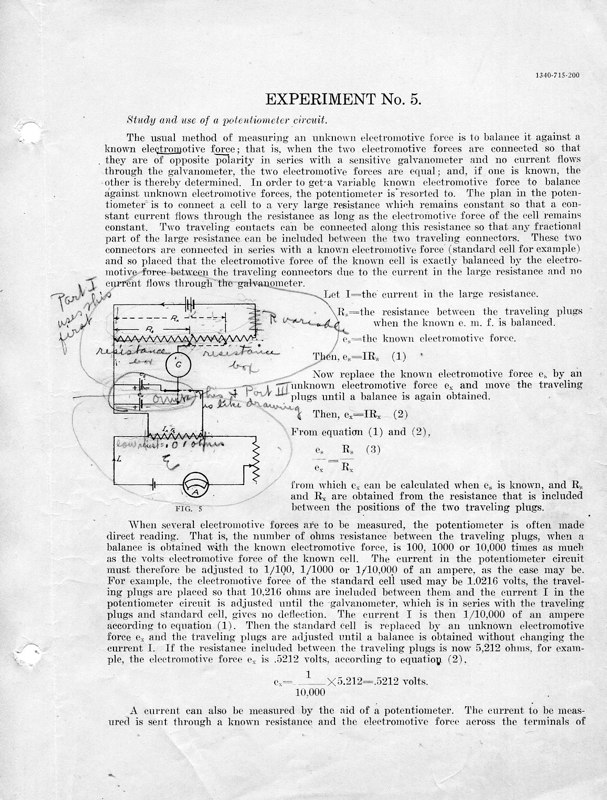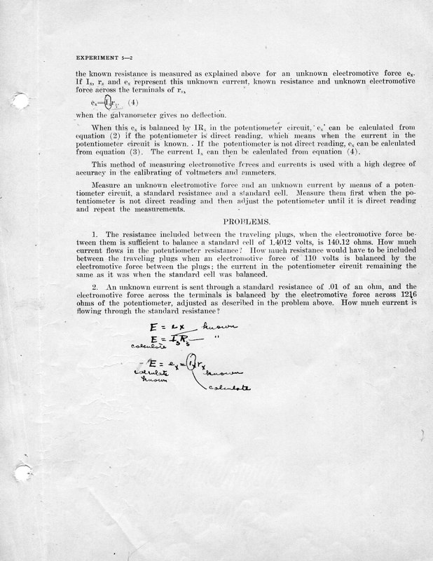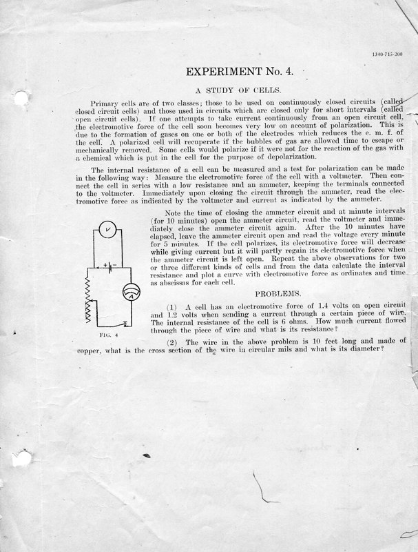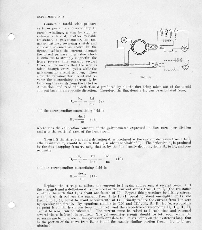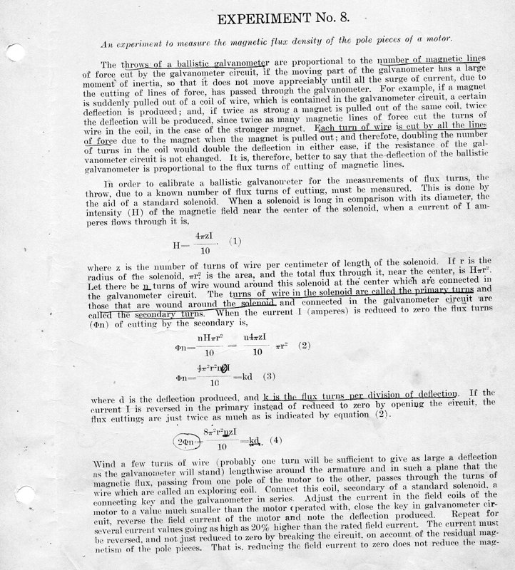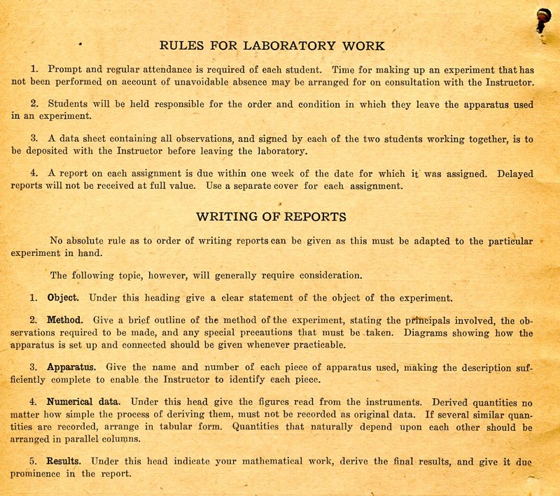 The course Physics 42,2 was an upper division course entitled, Magnetism, Electricity, Light and Sound. The lecture met for three hours each week and the laboratory also was a three-hour session. Prerequisites: Mathematics 1 (This was an applied mathematics course for engineering students, there was also a Department of Pure Mathematics at this time.) Physics 1—General Physics or Physics 38—Mechanics and Heat. Lecture was in K Hall and laboratory was in the Main Building. It must have been a popular course, since, in 1921, eight sections were listed.