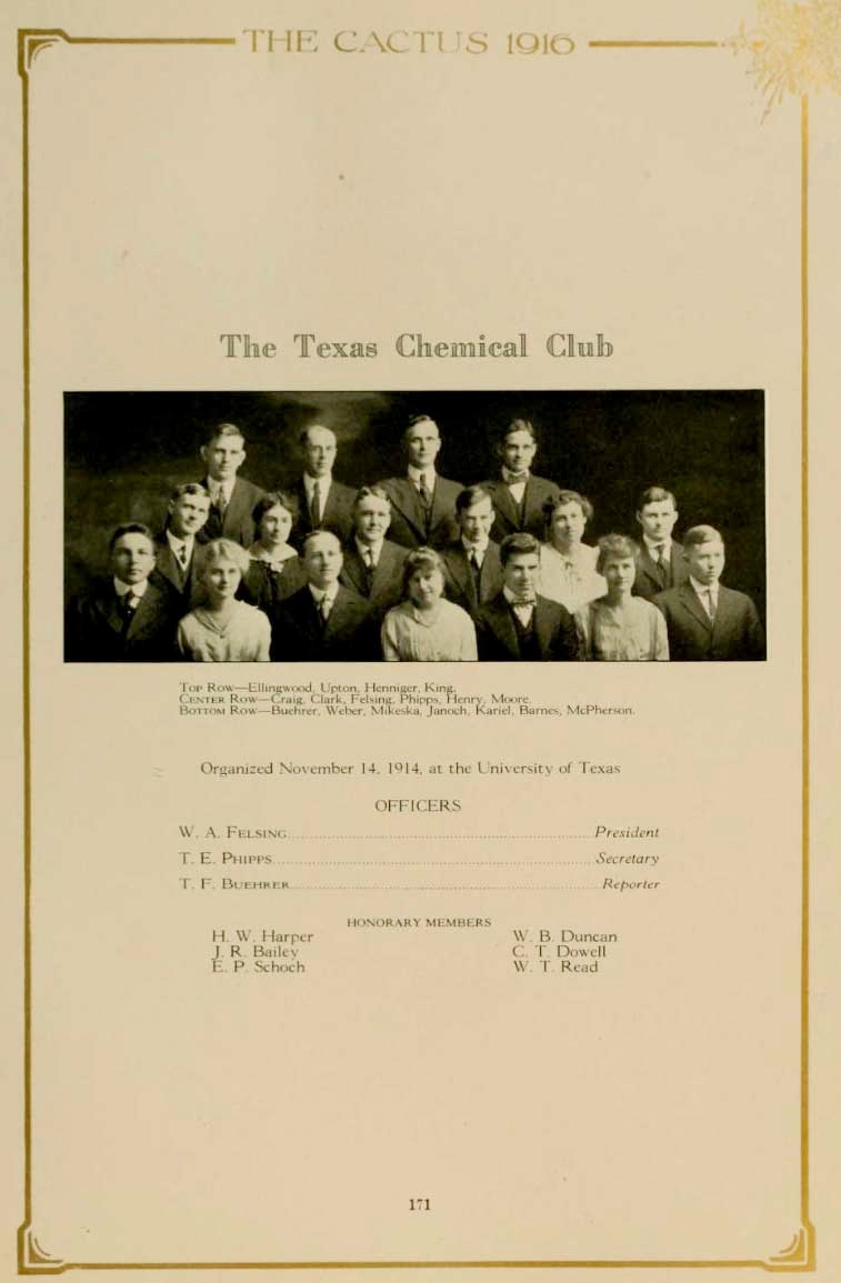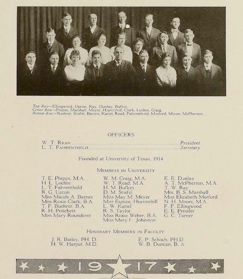 Maude Barnes, front row, second from left, Roxie Clark, middle row, third from right, Thornton Read, front row, fifth rom right. University of Texas yearbook, Cactus, 1917.