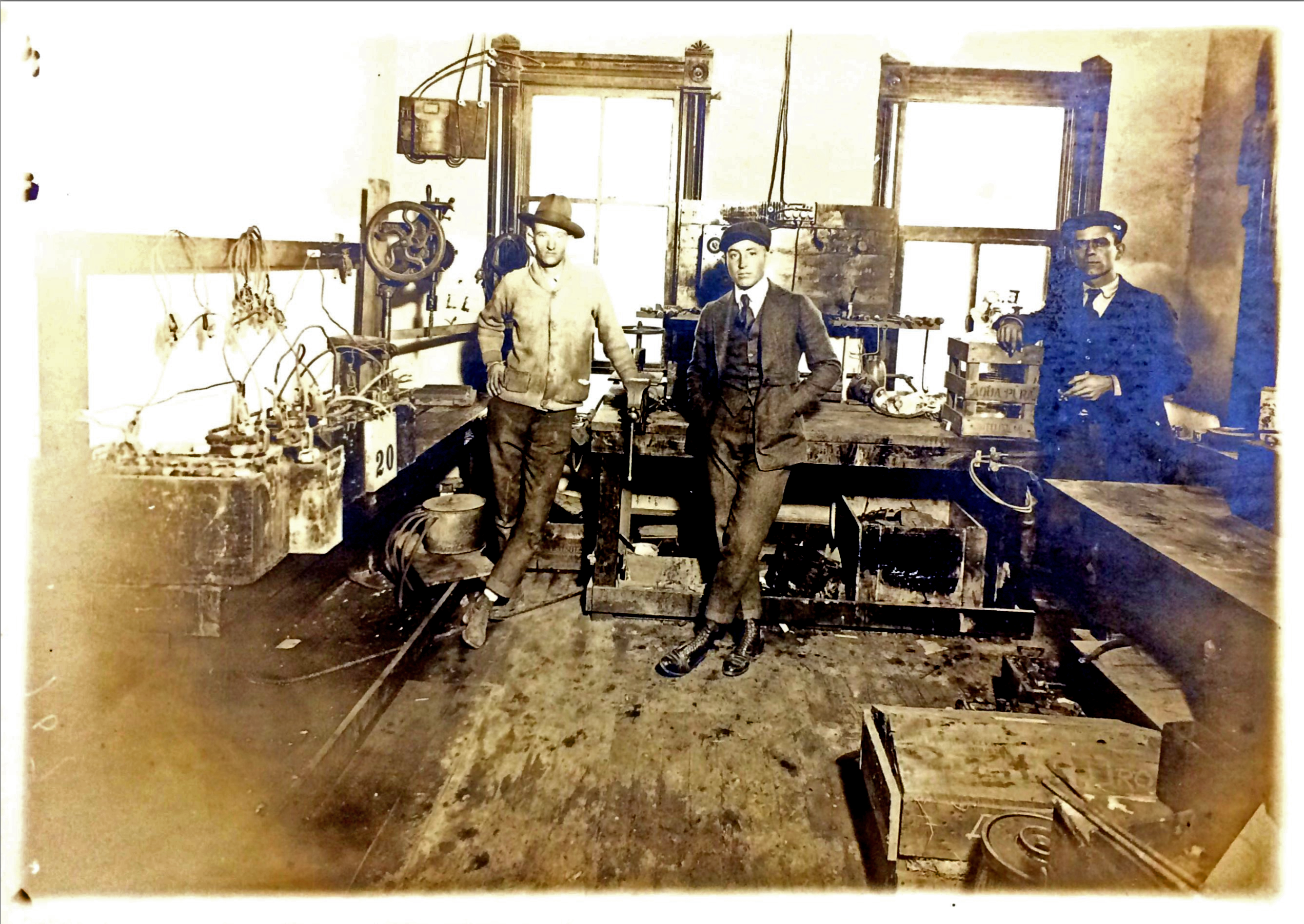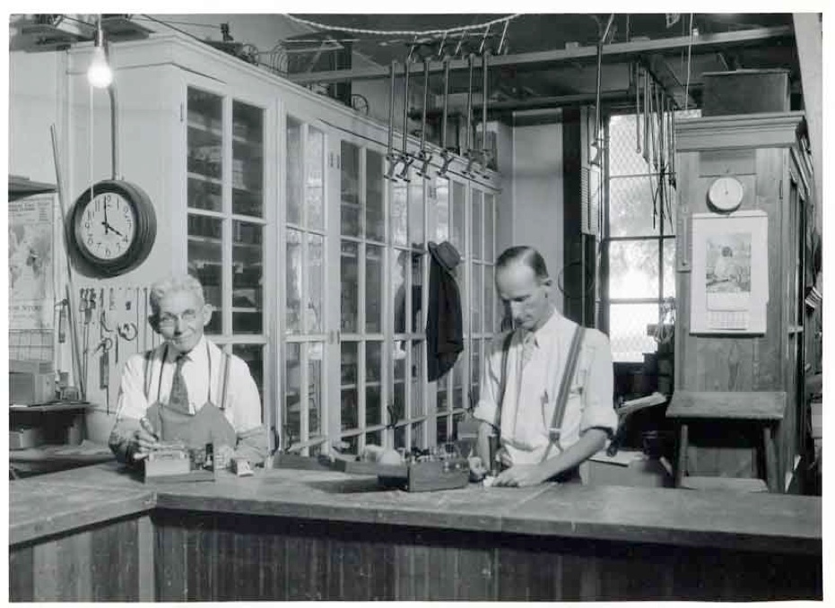Adolph Gruber, (brother of Louis Gruber) and Earl Dickens, mechanicians, in the equipment supply room, Main Building, 1931.