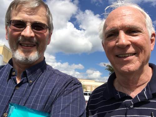 Tom came to UT from Tracor, where he worked with Jay Kaufman in the Ground Test Division. Jay joined UT first to design equipment and Tom asked him to be on the lookout for an opening. When one came available, Tom applied and was hired. Tom remembers the Electronic Shop being in Painter 209 across from the glassblower shop. After Jay left UT, Tom and John England became the equipment designers. At right is Dennis Wagner and Tom Cloud, Oct. 10, 2016.