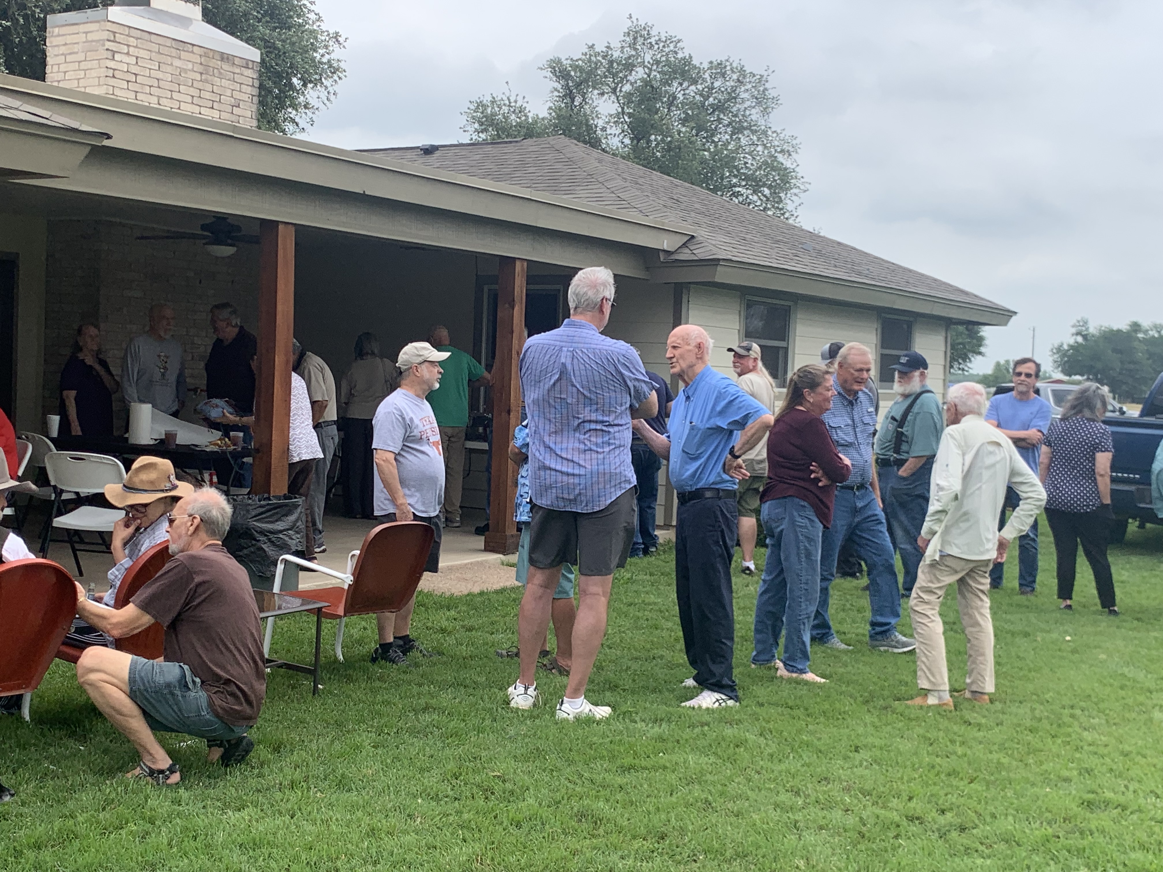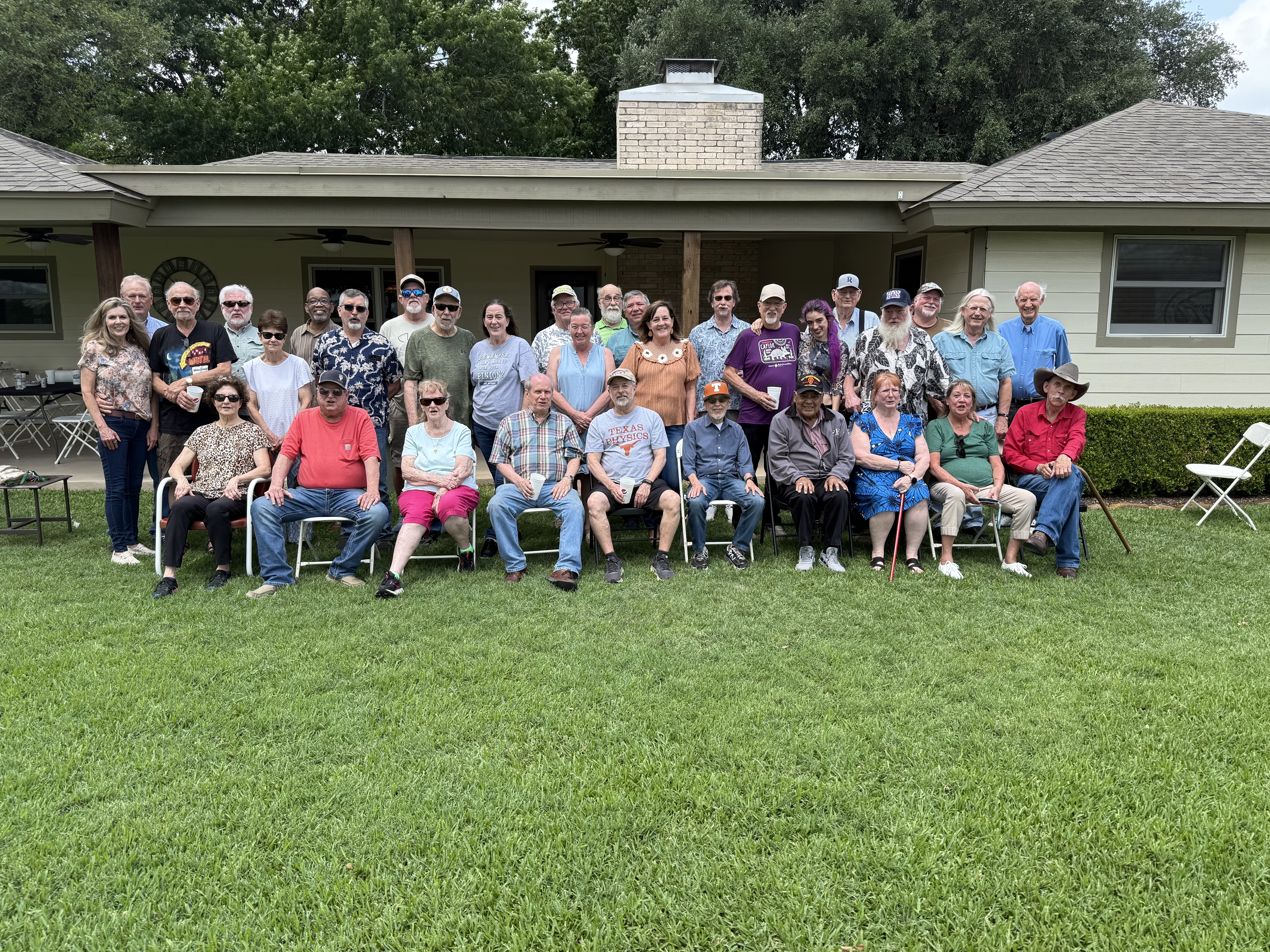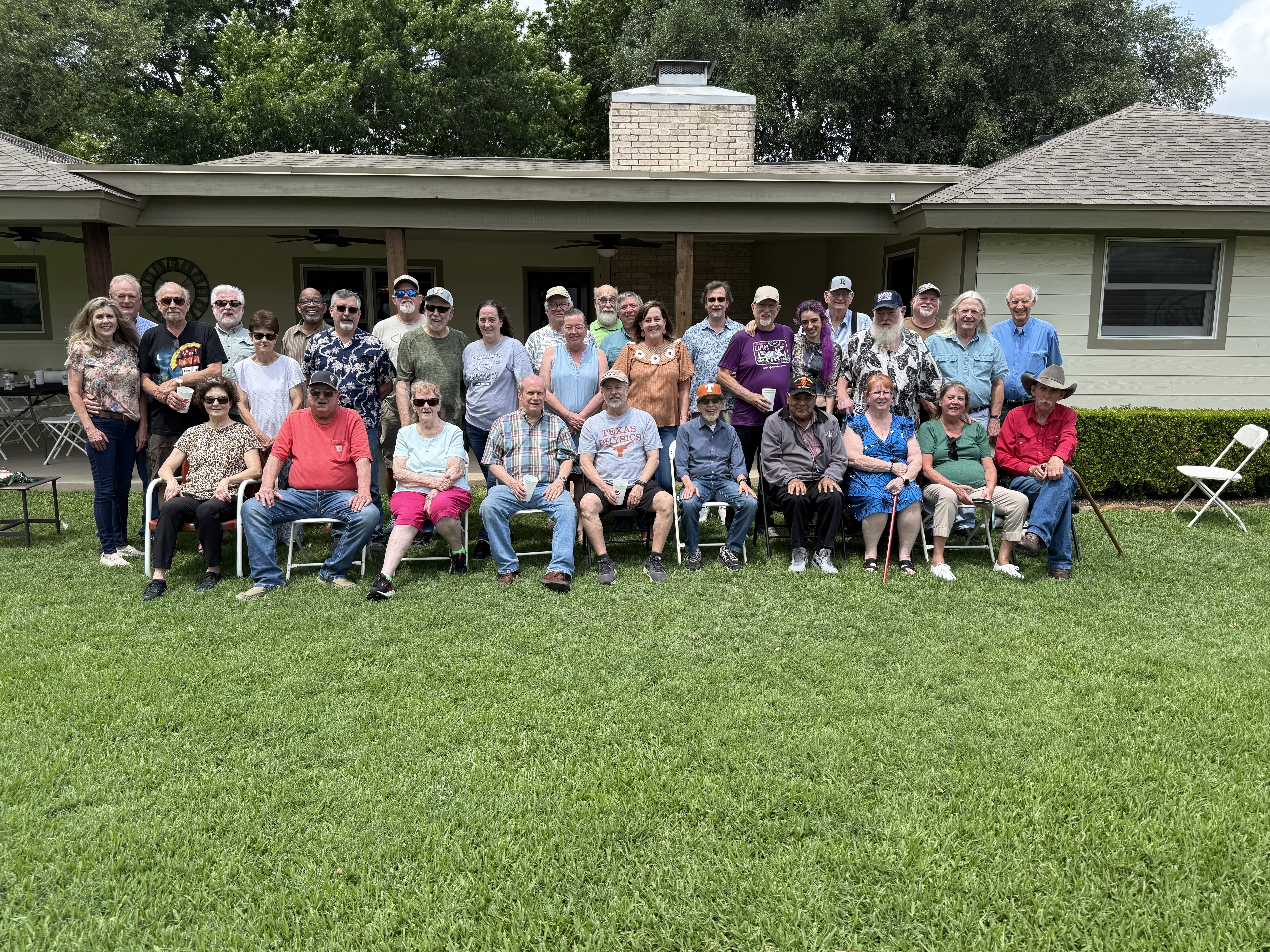 Physics Shop Reunion April 27, 2024, Home of Allan Schroeder and DeeDee Skidmore, Elgin, TX Front Row: Kevin Winslett, Allan Schroeder, Jesse Trevino, Sandy Campbell, Nelda Martinez, Judy Kilgore, John Kerrigan, Robert Hasdorff, Austin Gleeson (standing)Second row: Jadwiga Proga, Diane Cannon, Donnie Cannon, Bill Goss, Richard Goodwin, Jay Campbell, Jesse Martinez, Billy Kilgore, Dan Boyd, Carol Monette, Gary Thomas, Terry Cole, Alexis Calcote, David Nelson and Daisy Third Row: Nanette and Keith Carter, Herb Boehl, Jeff Sandefur, George Sandefur, Harold Williamson, Ricky Winslett, Marek Proga, Eric Rostetter, Mel Oakes