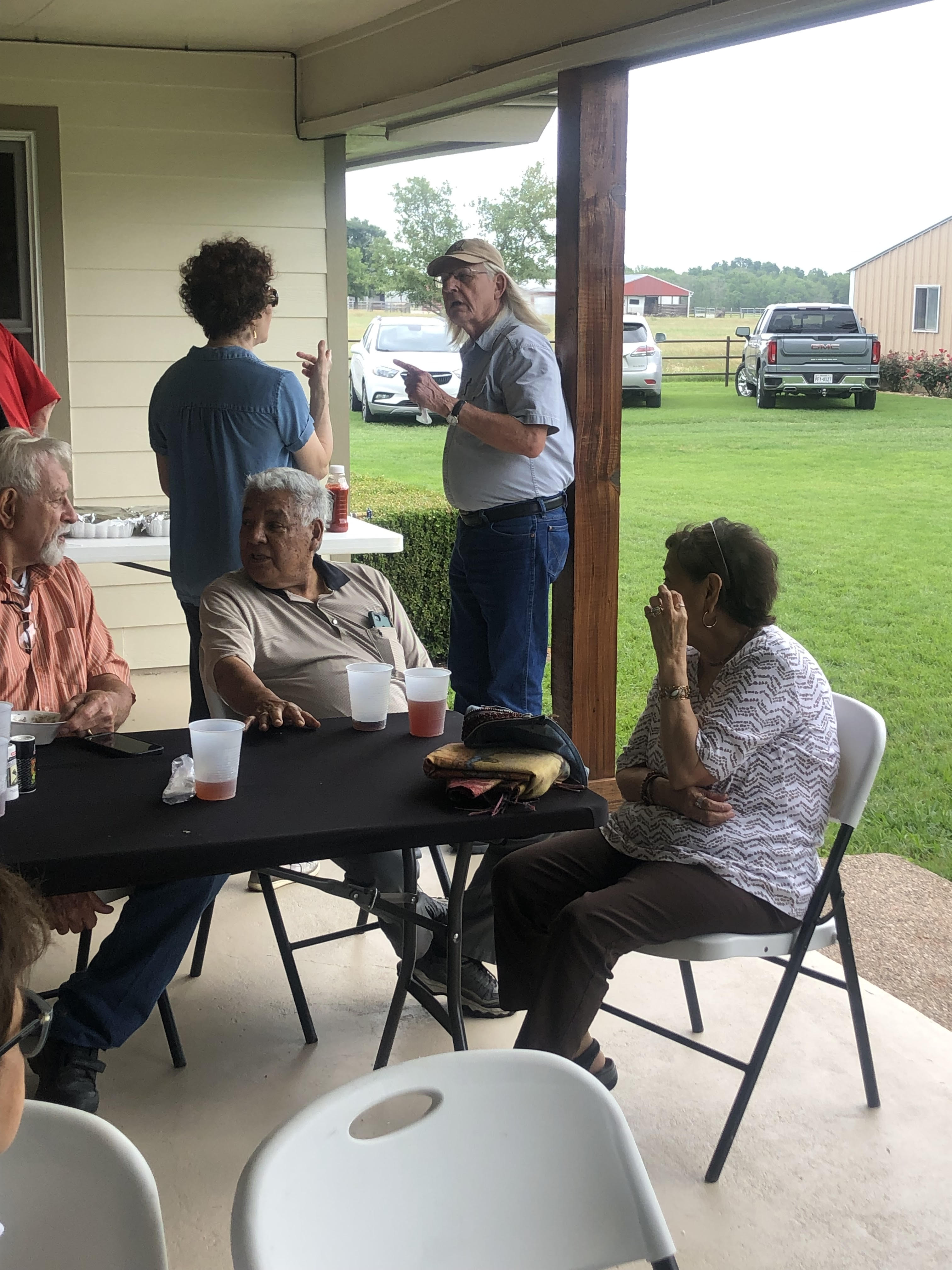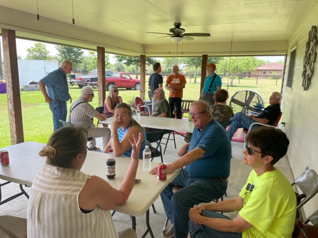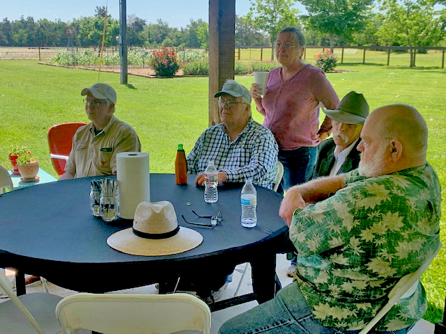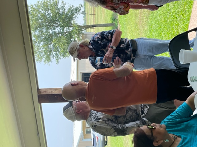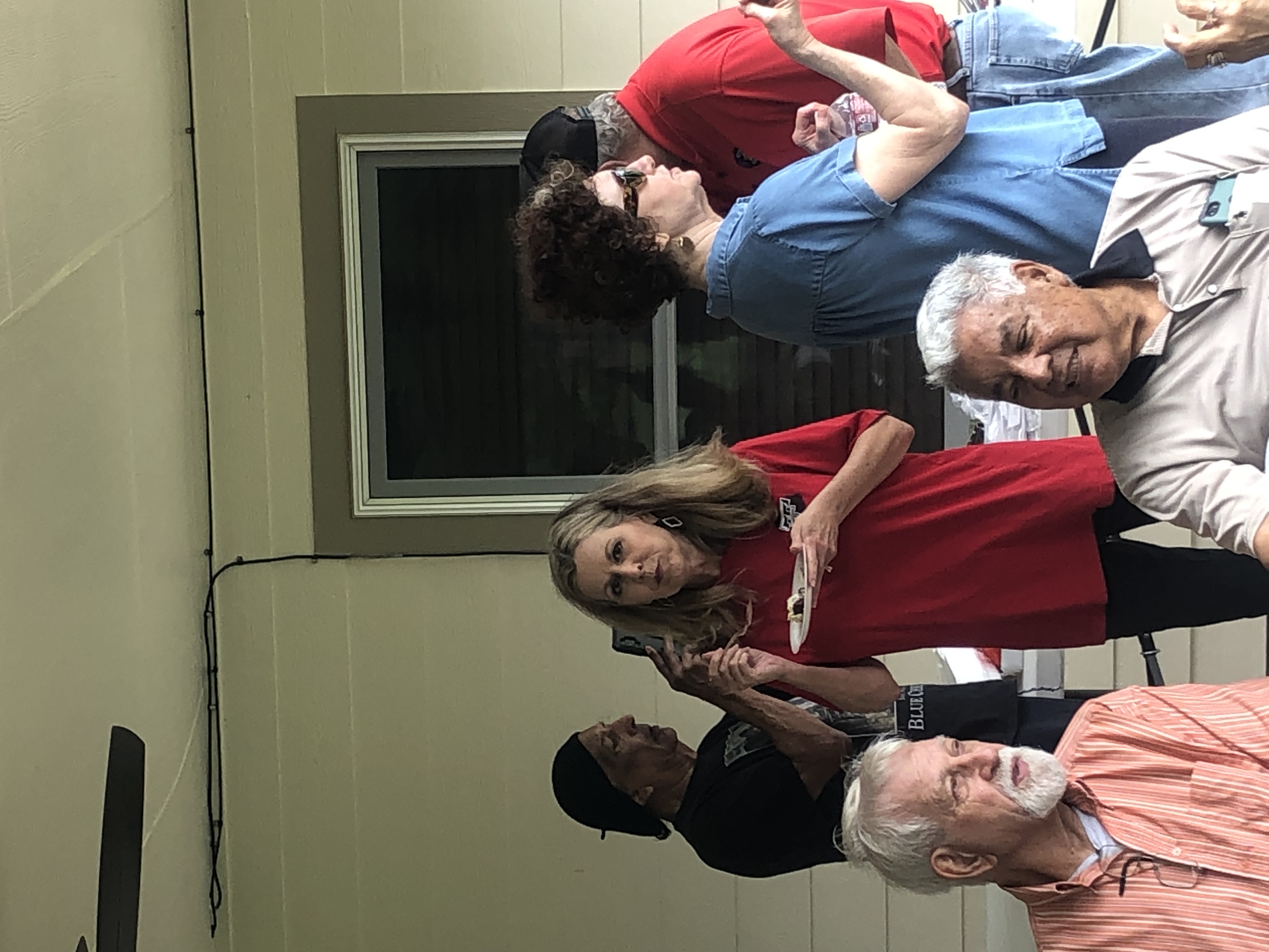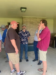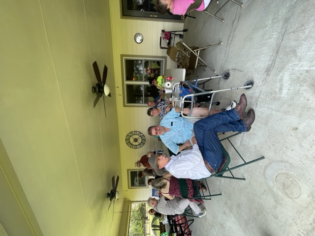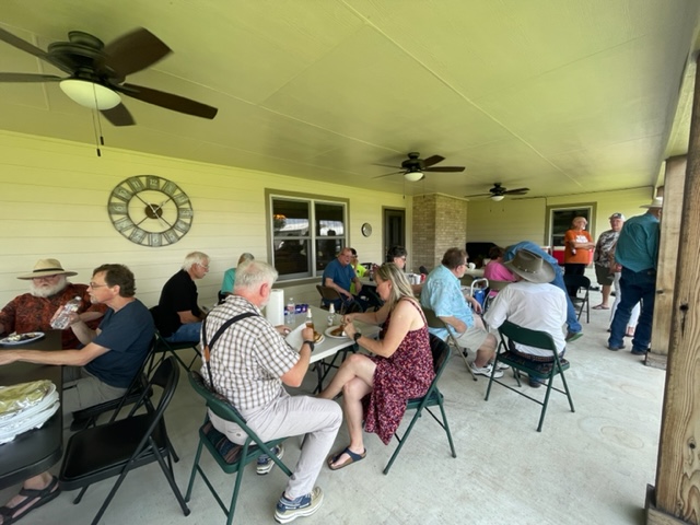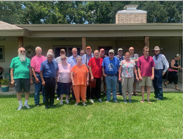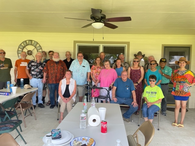 Physics Shop Reunion 2022, Home of Allan Schroeder and DeeDee Skidmore, Elgin, TX Front Row, Seated: Carol Monette, Donnie Cannon, Diane Cannon. |