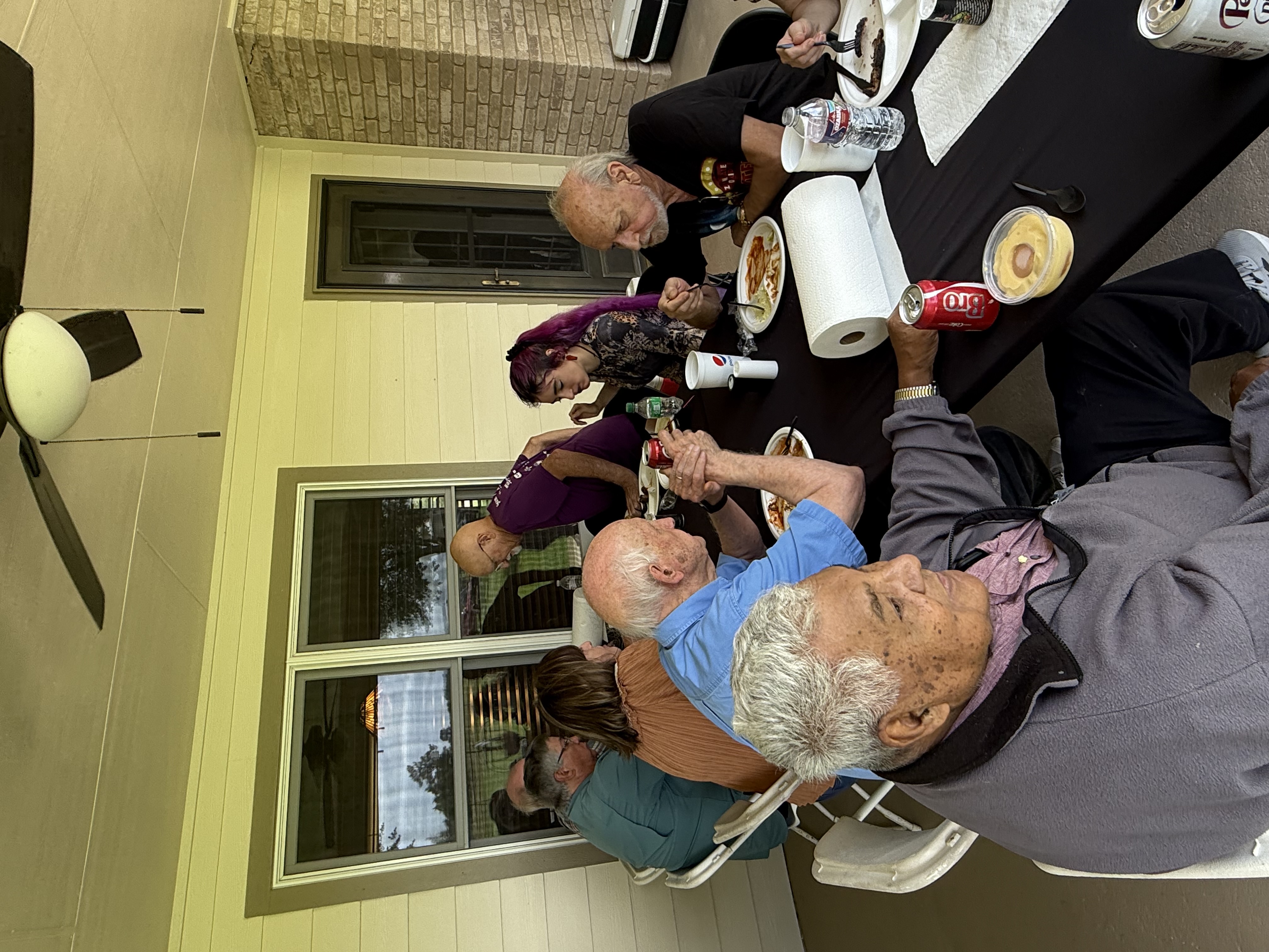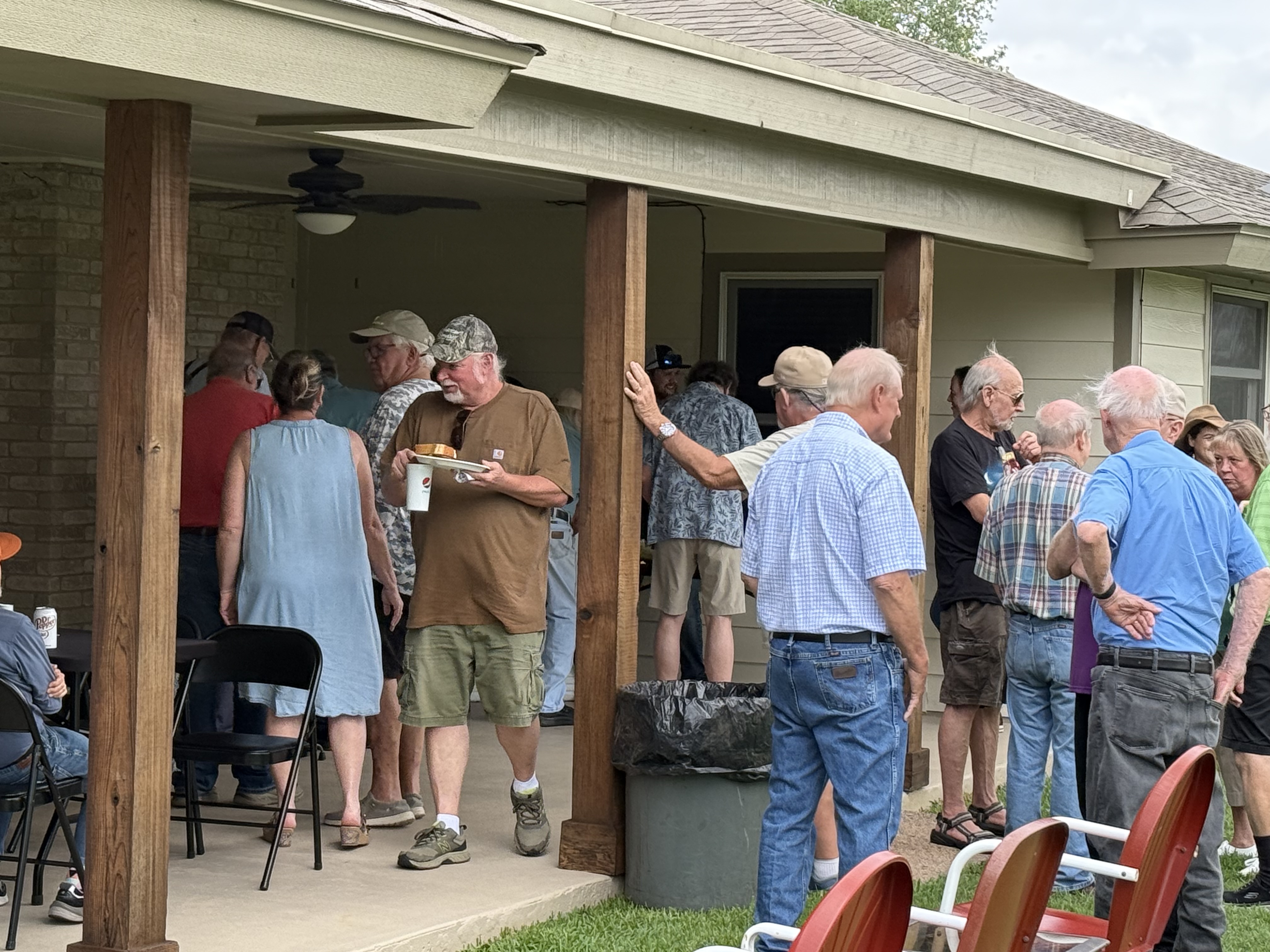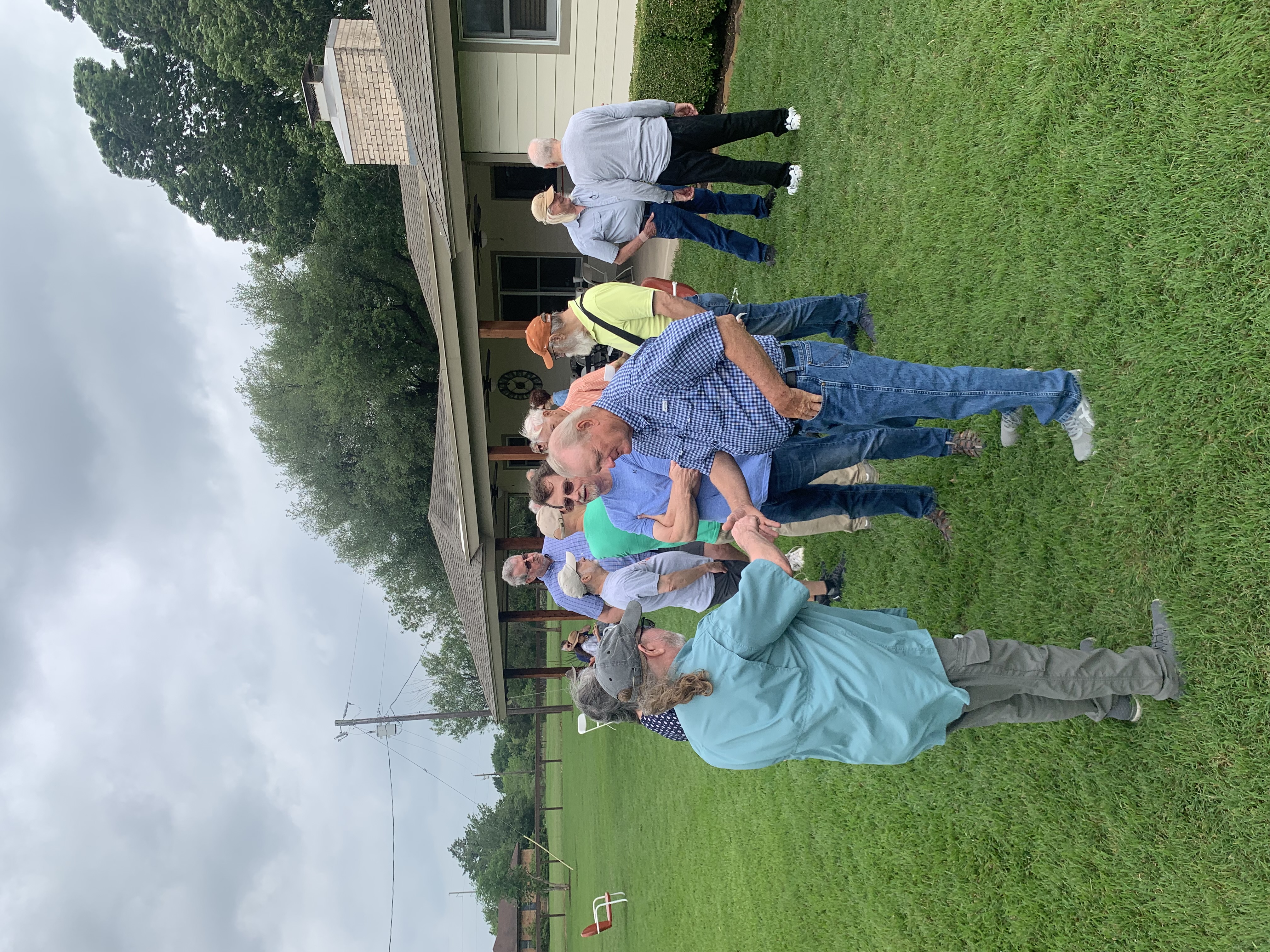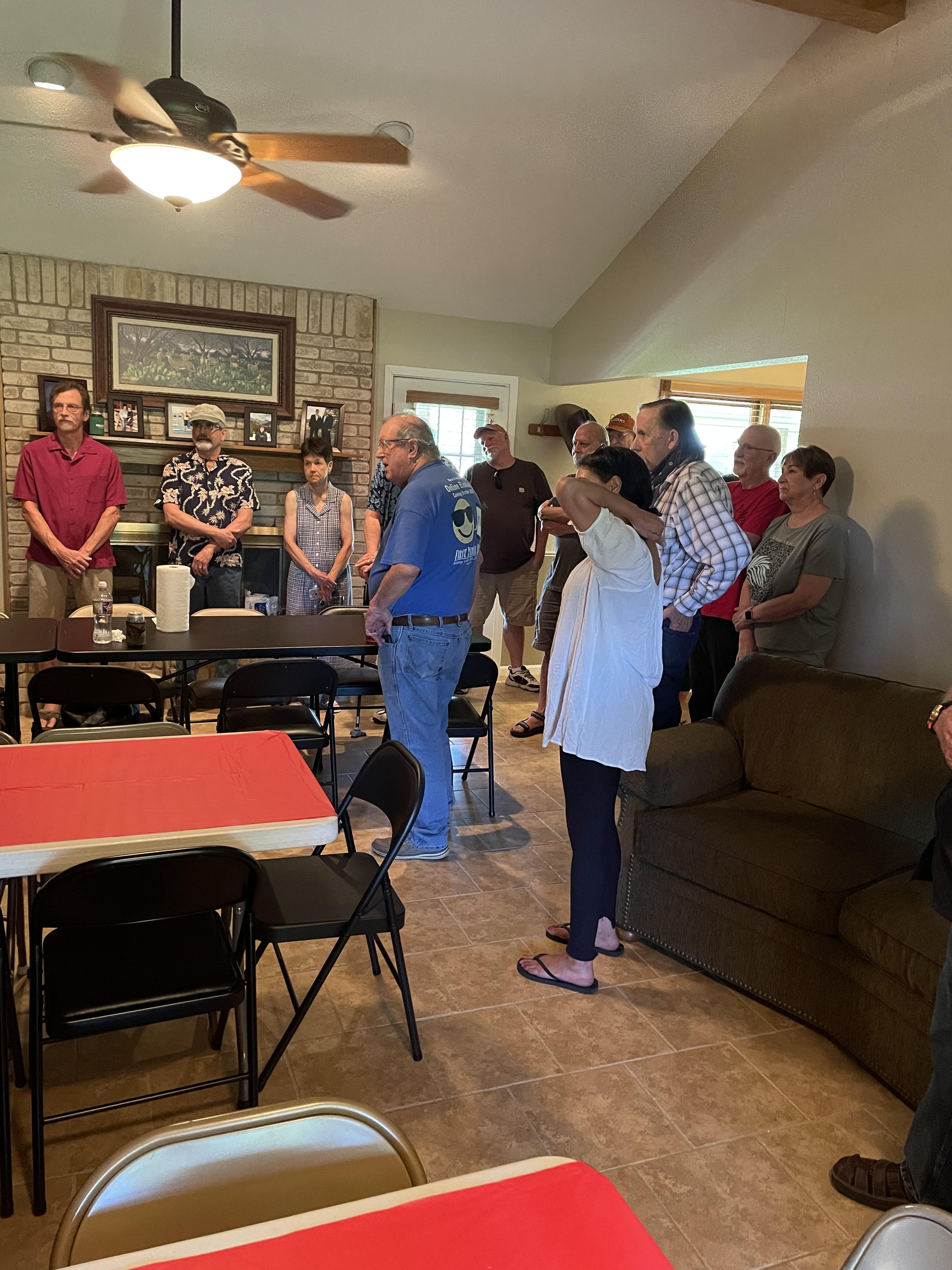 Physics Shop Reunion April 26, 2025, Home of Allan Schroeder and DeeDee Skidmore, Elgin, TX Front Row: Nanette Carter, Donnie Cannon, Judy Kilgore, John Keto, John Kerrigan, Harry Swinney, Jesse Martinez, Mary Franklin, Carol Monett, Terry Cole |