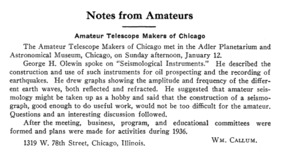 George was a skilled technician. He invented a portable cabinet for use as a science laboratory. He applied for a patent Mar. 26, 1957. He was issued a trademark in 1958. George was coauthor on the paper: "A High Vacuum Valve", Arthur E. Lockenvitz, Darrell S. Hughes, Leonard B. Lipson and George H. Olewin, Review of Scientific Instruments 19, 272 (1948). In 1967 he was Research Sciertist Associate II. In 1936, George gave a talk to the Amateur Telescope Makers of Chicago.