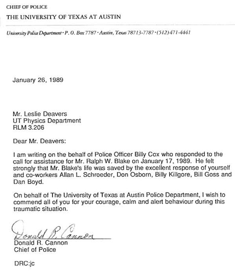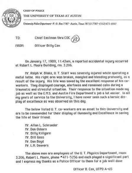 Ralph W. Blake, a fine machinist, was completing a project for Professor Jeff Kimble, who had moved to Cal Tech. It was the last day of work for Ralph, as he was retiring. He had a few holes to drill and completed those that morning. He reported to Les Deavers in the supervisor's office that he was finished. Les told him he could do whatever he wished as there was not time to complete another project. Ralph left the office and returned to the shop. A short time later, Les heard a sound which he described, "It was a noise you do not hear in a machine shop and you knew instantly it was not good." One of the staff came rushing in and asked Les to call 911. He reported that Ralph's sleeve had gotten caught in a metal lathe, and he was badly injured. Les made the call and entered the shop to see that Ralph was bleeding profusely and his arm was severely damaged. It was clear that this was a life-threatening injury. The staff's response to this critical situation was what can only be described as heroic. They comforted Ralph, they quickly cleared a pathway in the shop to provide quick access for the emergency personnel, and several of the men raced outside to clear a path in the parking lot for the emergency vehicles. They directed EMS to the shop. Their quick actions were key contributions to Ralph's survival. He lost his arm, but not his life. The two letters below attest to the exemplary performance of our shop staff.
