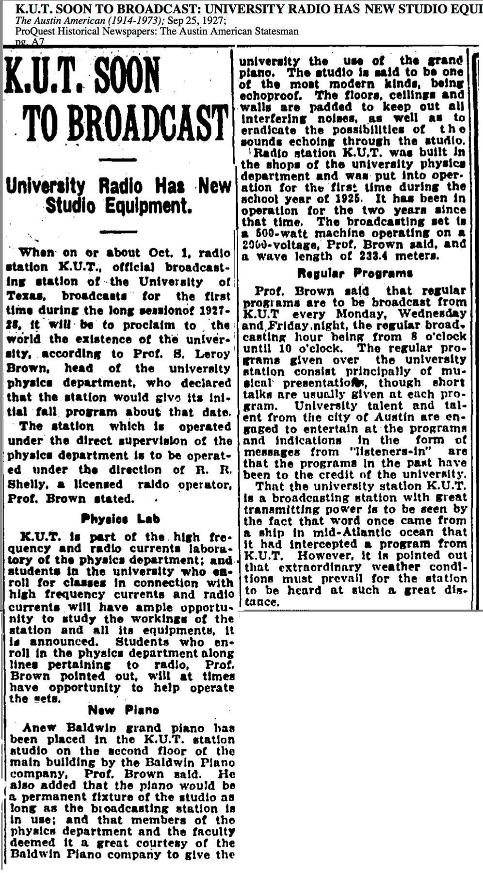 The following information from an online history of KUT is in direct conflict with the account given in The American Statesman article below. KUT's early years were ambitious but, by 1927, ambition had outrun the funding. The expense of operating and maintaining the station had simply become too great for the Physics Department to sustain. University President Harry Benedict appointed a committee to study the matter, and the committee recommended that the project be discontinued. The station was dismantled and the equipment returned to the Physics labs for experimentation.