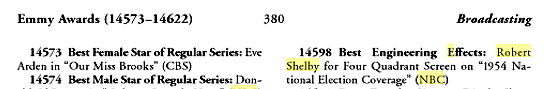 One of his students, Robert Shelby (photo at right from UT Cactus 1929, was the station operator and later became vice-president and chief television engineer of NBC. Quote from Zworykin, Pioneer of Television by Albert Abramson, copyright 1995: "There is some confusion about who was actually running the Empire State Building television project in 1931-32. According to "In Memoriam: Robert E. Shelby, He (Shelby) was placed in charge of NBC's first experimental television installation atop the Empire State Building. This probably means that Shelby took over from T. A. Smith, who had been in charge of studio operations. Thus Shelby was now in charge of its cameras (both live and film) and monitors for NBC while Engstrom of RCA was in charge of it radio transmitter and antennas (construction a technical) operations. RCA often did this with experimental projects, turning them over to NBC only when operationsl." Shelby won an Emmy in 1954. Shelby died in 1955 at the age of 49. He was awarded the David Sarnoff Gold Medal was awarded posthumously to Robert E. Shelby in 1956 for "For his dedicated interest and efforts in radio and television work, notably in the formulation of the signal specifications for compatible color television and his many patents concerning an electronic modulator for constant-frequency variable dot transmission." Shelby had 37 U.S. patents in radio and television, won three major awards from professional societies, and received two Emmy nominations and one award..