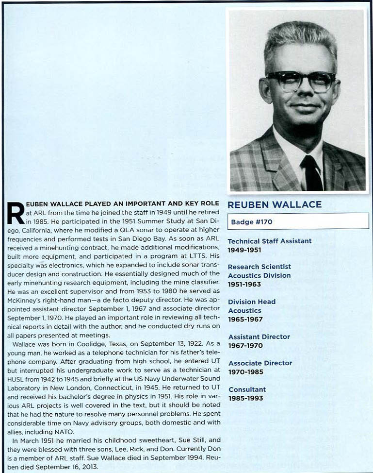 At UT Applied Research Laboratories (ARL ) [formerly Defense Research Laboratory (DRL)], from the time he joined the staff in 1949 until he retired in 1985, his role in various ARL projects is well-covered in the following text, but it should be noted that he had the nature to resolve many personnel problems. He spent onsideraltime on Navy advisory groups, both domestic and with allies, including NATO. He participated in the 1951 Summer Study at San Diego, California, where he modified an OLA (Ocean Land Atmosphere) sonar to operate at higher frequencies and performed tests in San Diego Bay. As soon as ARL received a mine-hunting contract, he made additional modifications, built more equipment, and participated in a program at LTSS. His specialty was electronics which he expanded to include sonar transducer design and construction. He essentially designed much of the early mine-hunting research equipment, including the mine classifier. He was an excellent supervisor, and, from 1953 to 1980, he served as Chester McKinney’s right-hand man—a de facto deputy director. He was appointed assistant director September 1, 1967, and associate director September 1, 1970. He played an important role in reviewing all technical reports in detail with the author, and he conducted dry runs on all papers presented at meetings. This information comes from A History of Applied Research Laboratories, Vol. 1, 1945–1980, by Chester McKinney and Clark Penrod,