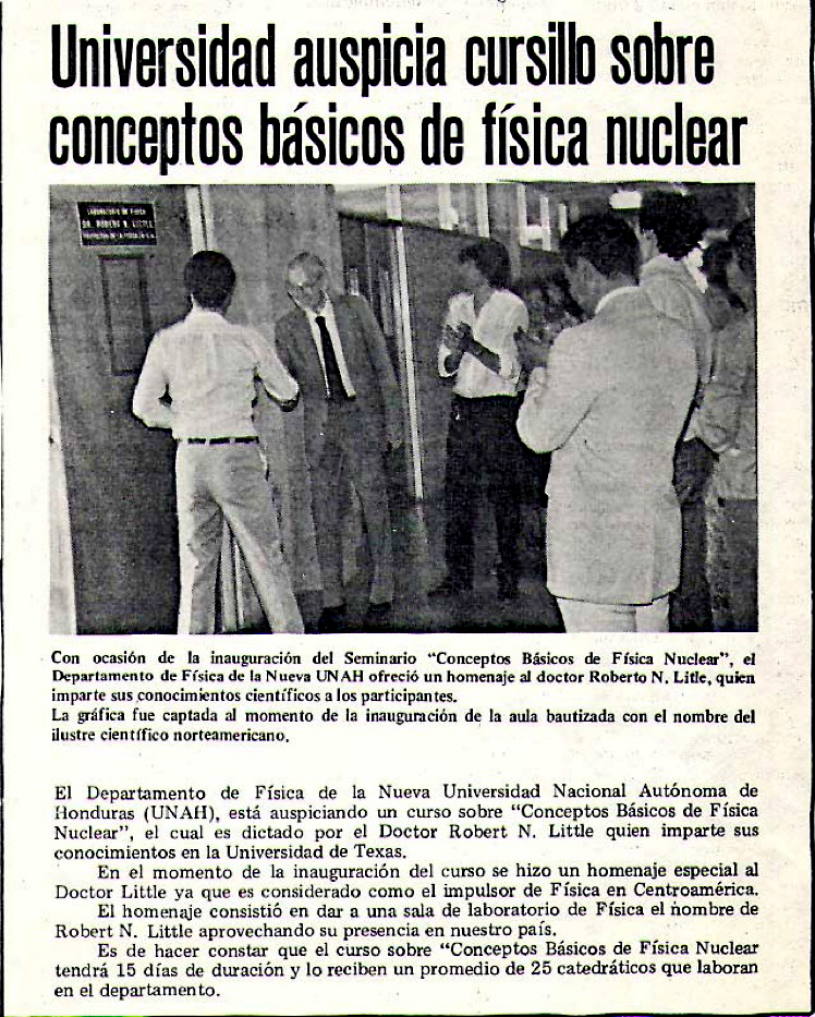 Bob's decision to assemble a struggling group of Central American physics teachers in Austin and raise, significantly, their knowledge of physics was clearly a watershed for physics in these countries. He gave them pride in their work and raised, dramatically, their expectations and those of their students. His name is much revered by this growing community of scientists and teachers. III health prevented him recently from attending his Honorary Doctorate presentation in Guatemala. Bob has reminded us that one man can still make a difference, a lesson we so comfortably forget. We know Bob Little cannot be replaced. However, inspired by his lifelong dedication to excellence, our resolve must be, we will do more. It is the least that he would expect of us.