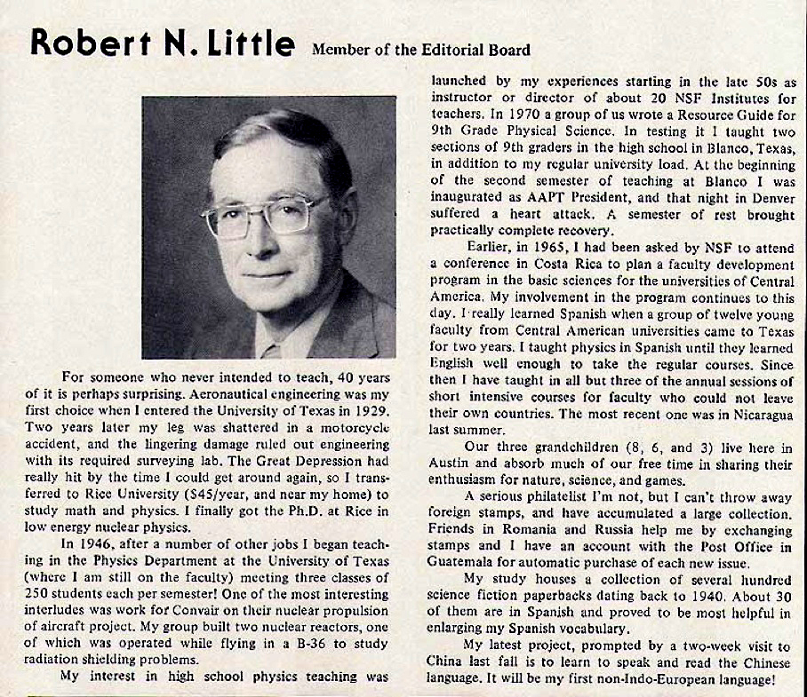 In 1946, I began teaching in the Physics Department of The University of Texas, three classes of 250 students each per semester! The summers of 1948, 1949 and 1950 were spent at the Los Alamos Scientific Laboratory doing neutron scattering experiments and designing a compact 10 kV D-T neutron source. In 1953, Convair (now General Dynamics/Fort Worth) induced me to get a leave of absence and work with them on the nuclear propulsion of aircraft project. This work started before the leave could begin so, for a semester, the schedule was three classes on Monday, train ride to Fort Worth Monday night, work at Convair on Tuesday, fly to Austin Tuesday evening, then repeat the schedule for the rest of the week (including Saturday). The leave of absence was complete for two years, and I continued as a two-days-per-week consultant four more years until the project was terminated. During this period, my group built two nuclear reactors, operating one to determine radiation damage effects on aircraft systems and the other was operated while flying in a modified B-36 to study radiation shielding problems in a flying airplane. By this time, the National Science Foundation Institutes for Teachers was in full swing, and I became involved to the point of being an instructor or director of some twenty of them. It was this experience that caused me to understand something about the problems of a high school teacher of physics. The Texas Education Agency intensified its efforts to improve the teaching of physics and focused its attention on junior high school physical science which is the last physics or chemistry taken by 75% of the people of the United States. In Texas, it is taught by teachers, 50% of whom have had no further physics than what they got in the ninth grade physical science course. To help these teachers, the TEA asked a group of six, two university physicists, two university chemists, and two experienced good junior high school teachers, to write a Resource Guide for Ninth Grade Physical Science. The resulting Guide emphasizes observations by the students by describing hundreds of possible student activities and explaining to the teacher what kinds of logical inferences are possible from these observations. In testing the Guide, I taught two sections of ninth grade Physical Science in the high school in Blanco, Texas (in addition to my regular university teaching load), in the manner prescribed by the Guide. The students liked it very much, but we did shorten and modify some of the activities as a result. The school had zero equipment, and we had to improvise, even to the point of wiring the room for electricity. At the beginning of the second semester of teaching at Blanco, I was inaugurated as AAPT president (1970), and that night in Denver suffered a heart attack. A semester of rest gave practically complete recovery.