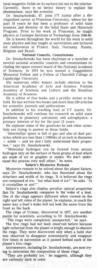 As a professor of solid-state physics, first at the Carnegie Institute of Technology and then at Princeton University, Dr. Smoluchowski concentrated on understanding the structure of atoms, metals and crystal lattices. But late in his career at Princeton, and then, after 1978, at Texas, he changed his focus to much larger structures, notably planets and other celestial objects like dust rings.