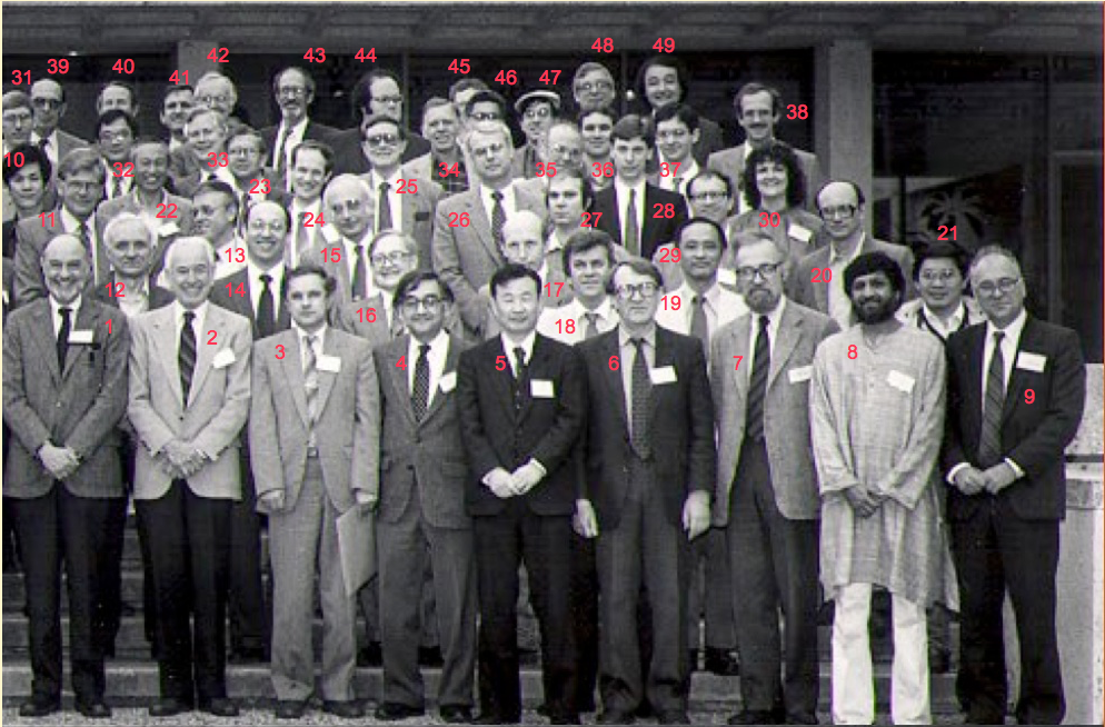 (L to R), Front Row, 0. G. Y. Fu, 1. ?, 2. Elena Montalvo, 3. Jill Marshall, 4. Vernon Wong, 5. Taina Kurkio-Suonio, 6. Buff Miner, 7. Carolyn Valentine, 8. Hamid Ouroua, 9. ?, 10. ?, 11. Jose Boedo, 12. Jonathan Watkins, 13. Masatada Ogasawara, 14. Y. Z. Zhang?, 15. C. S. Liu, 16. Walter Sadowski, 17. Gary Craddock 18. Tihiro Okawa, 19. Marshall N. Rosenbluth, 20. Herb Berk, 21. Tetsuo Kamimura, 22. Roger Durst, 23. Fred Hinton, 24. David Ross, 25. ?, 26. Jim Wiley, 27. Terry Rhodes, 28. ?, 29. Hans Fleischmann, 30. Wendell Horton, 31. David Thayer, 32. ?, 33. ?, 34. Paul Terry, 35. Amitava Bhattacharjee, 36. Gary Hallock, 37. ? , 38. Shoichi Yoshikawa, 39. Roger D. Bengtson, 40. ?, 41. Alan Ware, 42. ?, 43. James Van Dam, 44. Ken Gentle, 45. ?, 46. ?, 47. ?, 48. Hamid Bighari, 49. ?, 50. Kevin McGuire, 51. ?, 52. ?, 53. ?, 54. Mel Oakes, 55. ?