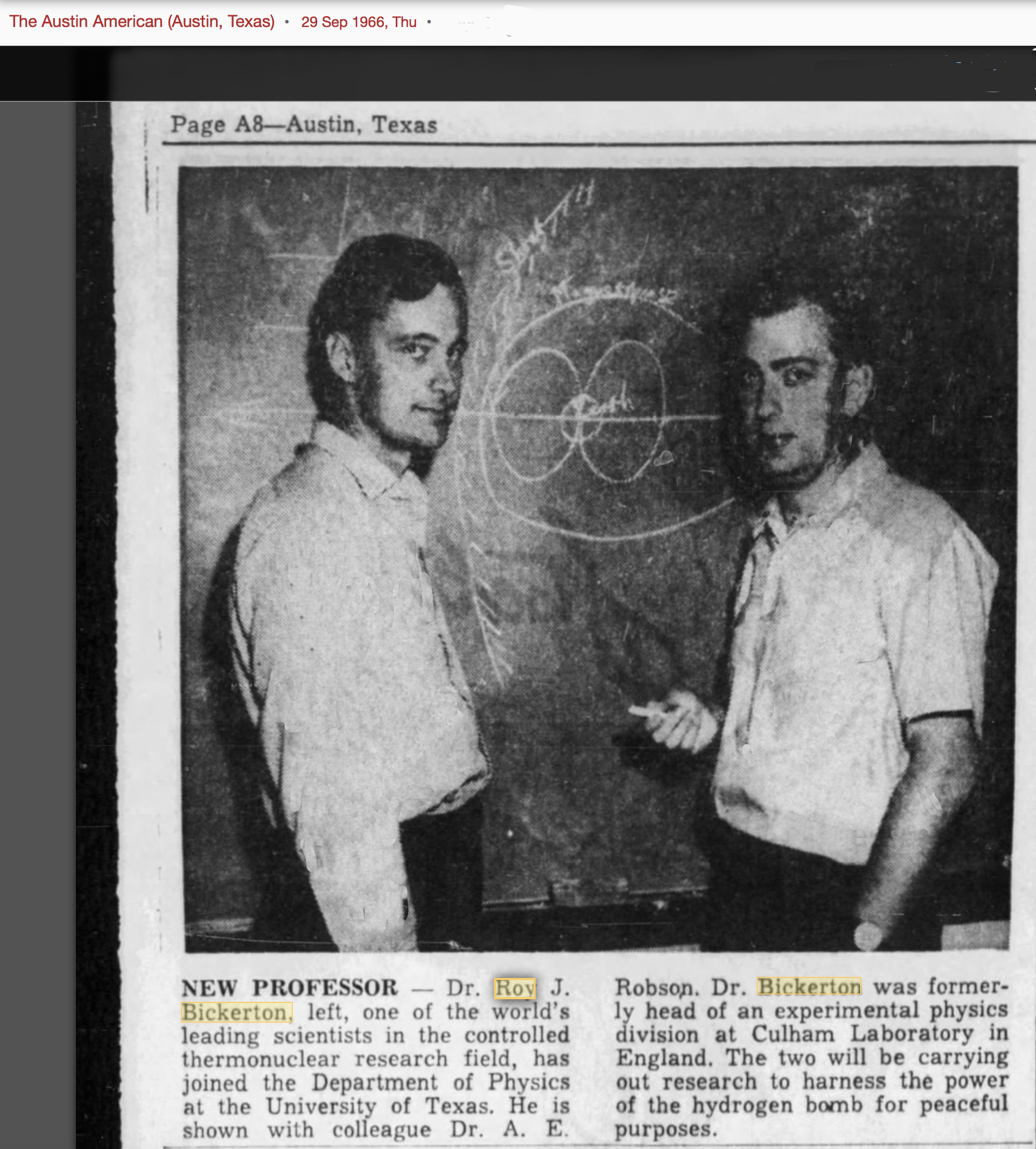 Roy J. Bickerton joined the Fusion Research Center in 1966, remaining for a year. He was on leave from the Atomic Energy Authority at Culham, England. He brought with him his wife, Gladys, and four sons, David, Jeremy, Peter, and Richard. They came on the Cunard liner Queen Elizabeth. Bickerton was a former director of the world’s largest fusion magnetic experiment, the Joint European Torus at Culham Laboratory. It was at Culham that he made several major contributions to fusion research.