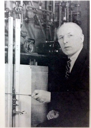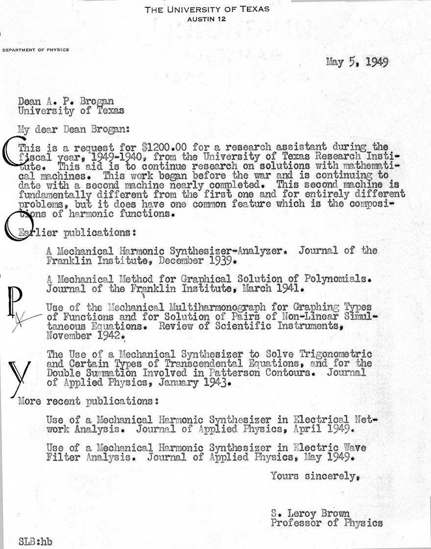 S. Leroy Brown's research was in a number of areas—some of them restricted to problems for which he could find a piece of equipment. If there was no equipment, his paper was only a paper study of the problem. The topics covered included heat transfer, Bernoulli's Principle and the curving of a baseball, new types of resistance thermometers, thermal electromotive forces, radio-frequency electrical measurements, residuals of inductance and capacitance in resistance coils, and other subjects. He conceived and built a complex mechanical harmonic synthesizer analyzer, which was, in many respects, a forerunner of electrical analog computer. Late in 1939, he did extensive work on his multi-harmonograph for solving pairs of non-linear simultaneous equations and transcendental equations, and in doing certain types of network analysis. Brown is shown at right with this device.