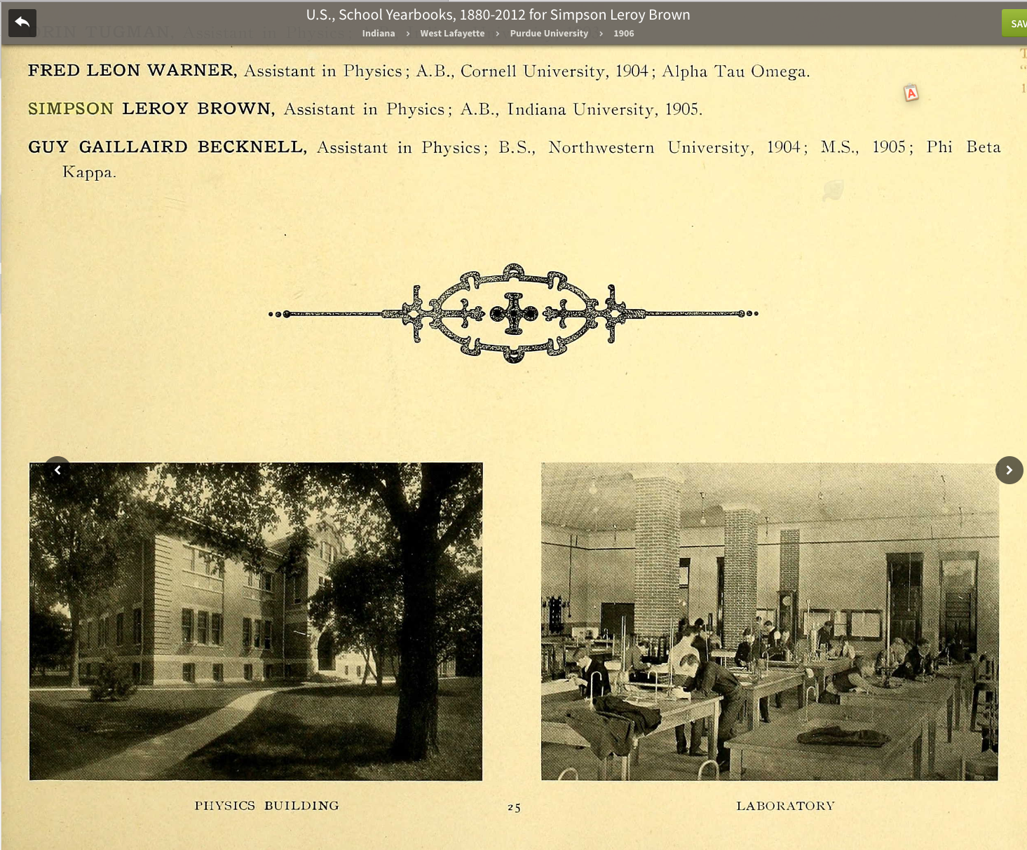 Simpson Leroy Brown was born November 23, 1881, in Brownsburg, Hendricks County, Indiana to John Wiman (1854–1894) and Mary Catherine Huffer (1854–1934) Brown. His siblings included Arthur Linsey, Mary Edna and William Amasy. His father died in 1894 and his mother was a landlord in 1900.
