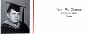 John Wallace Carlson, born 1916, Quitman, MS. Attended Miss. College and LSU. Picture shown is from LSU in 1939. He is listed in the Sigma Pi Sigma List.