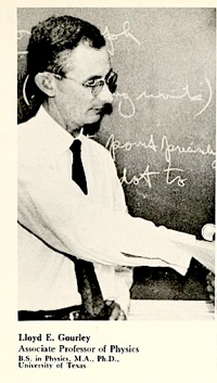 Lloyd E. Gourley Jr. (1923_2006), BS 1946, MA 1948, PhD 1959, became professor of physics at Austin College in Sherman, TX. He was a student of Darrell Hughes. Bob married fellow physics major Mary Gowen Foulks in 1948. She also became a professor of physics at Austin College. Following the death of Mary in 1971 he married Martha J. Terry in 1978.