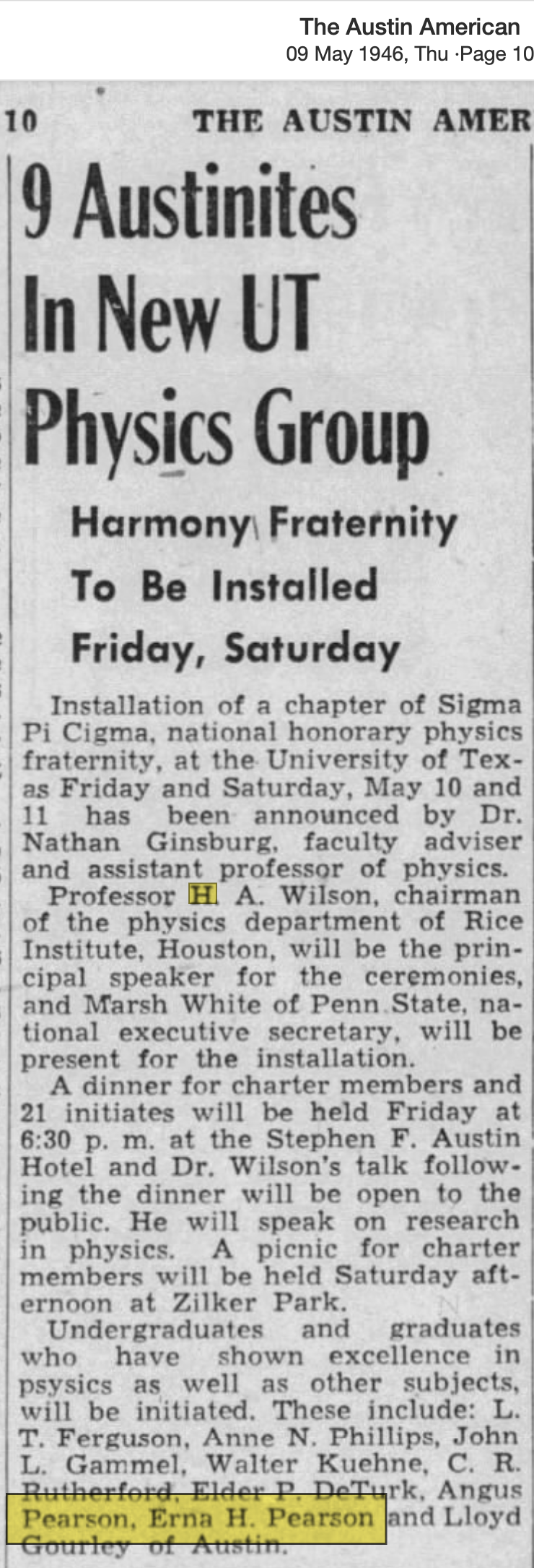 Elder Pattison DeTurk, a 1946 newspaper article mentions local members of the new Sigma Pi Sigma group that has just been formed and that there will be an induction ceremony. Deturk along with L. T. Ferguson, Anne N. Phillips, John L. Gammel, Walter Kuehne, C. R. Rutherford, Elder P. DeTurk, Angus pearson, Erna H. Pearson and Lloyd Austin are initiates. DeTurk was born on December 13, 1911 in Reading, PA. In 1940 he is teaching at UT and working for the Romberg & Lacoste Gravity Meter Company. At the time of the Sigma Pi Sigma photo he would be 35. His draft registration form says he wear glasses.