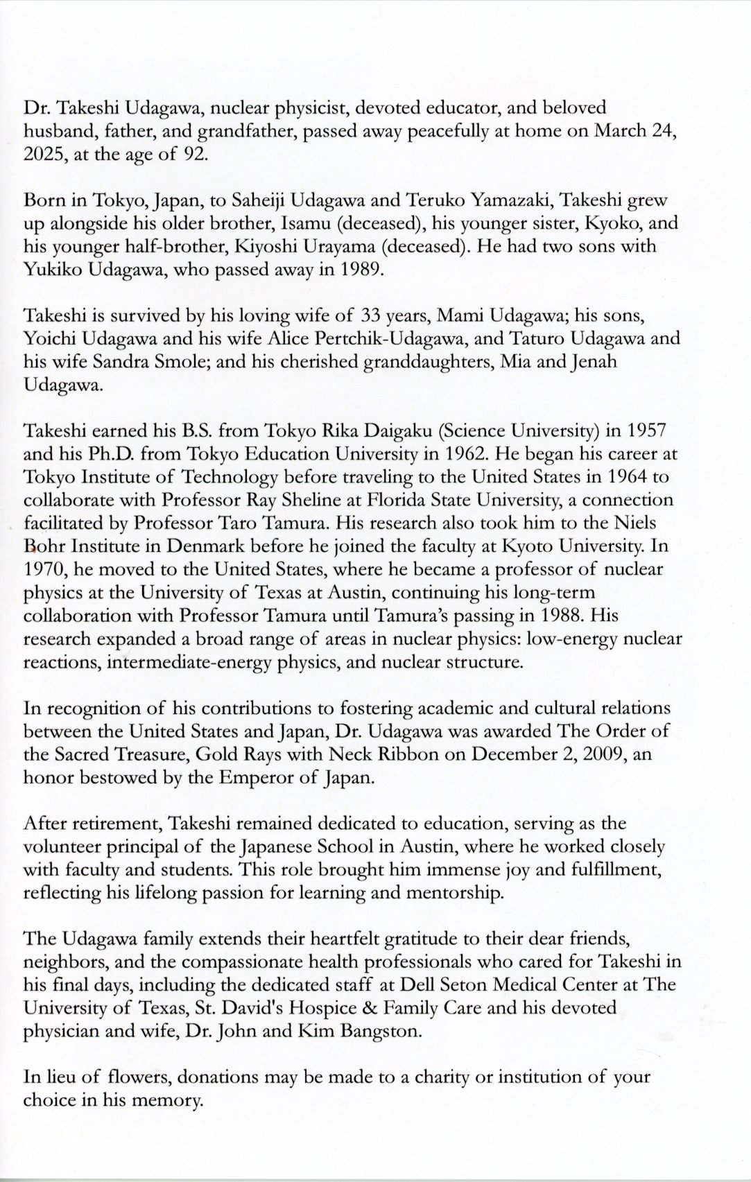 Takeshi died peacefully in Austin with his family present on March 24, 2025. A Celebration of Life was held on April 19, 2025. Below is the program from that celebration