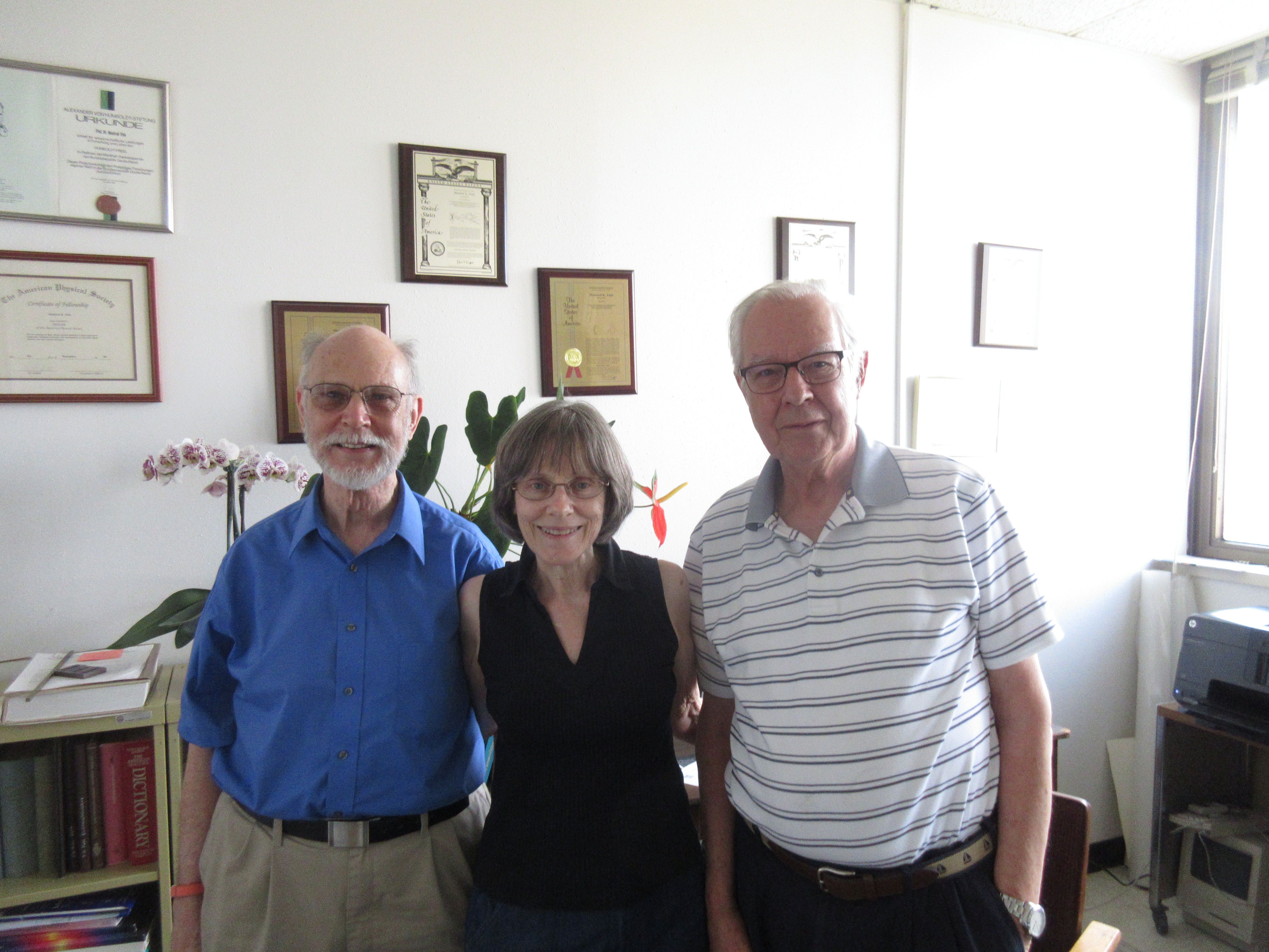 Ann commented, "Carl and I have really enjoyed being a part of an undergraduate campus and we are both passionate about physics and astronomy education." Carl and Ann have two sons and two daughters who are all graduates of Penn State University. One son is a physics and math major. One daughter has a PhD in biophysics and works in research and development in pharmaceutical development. The younger son is an aerospace engineer and the younger daughter is a chemistry educator in high school. Carl, Ann and Professor Manfred Fink are shown below in summer of 2017.