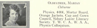 As a sophomore, she was tapped into the Orange Jackets (left end of top row, picture at right), an honorary service organization. In her senior year, she was elected to Mortar Board, Cap and Gown, and president of Chi Omega. Anamary obtained her bachelor’s in 1933 and her master’s in physics in 1935.
