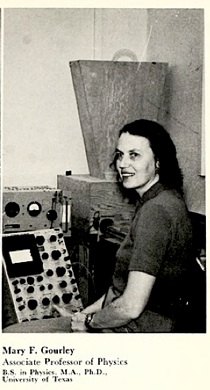 1959 Mary Gowen Foulks Gourley, (b. 1923–) PhD, dissertation title, Propagation and Interaction of Eastic Waves and Shock Waves in Solids. Student of Professor Darrell Hughes. She married fellow physics major, Lloyd E. Gourley Jr. in 1948. In 1955, she was at Research and Development Division, New Mexico Institute of Mining and Technology, Socorro, New Mexico. She worked in atmospheric physics. Later, she became a physics professor at Austin College, Sherman, TX. Her photo at Austin College is shown at right. Mary Gowen Foulks, (1923–1971) PhD 1959, Propagation and Interaction of Elastic Waves and Shock Waves in Solids. Student of Darrell Hughes. She married fellow physics major Lloyd E. Gourley Jr. in 1948. In 1955, she was at Research and Development Division, New Mexico Institute of Mining and Technology, Socorro, New Mexico. She worked in atmospheric physics. Later became a physics professor at Austin College, Sherman, TX. An article in May 19, 1959, Austin American Statesman, stated, "Gourleys Get College Posts, Mr. and Mrs. Lloyd E. Gourley Fr.,b oth of whom will receive their PhD degree in August from the University of Texas, will join the Austin College faculty in Sherman in September. Mrs. Gourley will be associate professor of mathematics and physics and Gourley will be associate professor of physics.