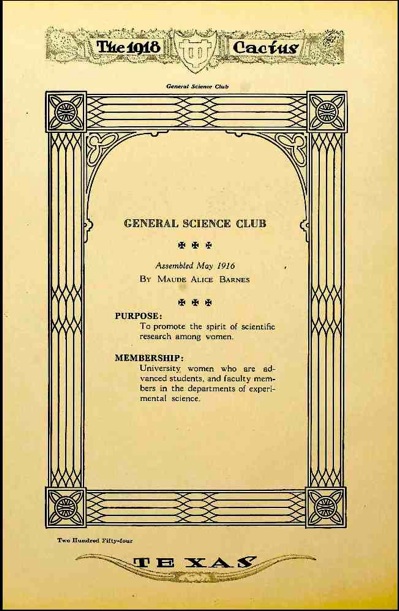 1916 Maud Alice Barnes, a chemistry student assistant, founded the General Science Club. The purpose was, “ To promote the spirit of scientific research among women.” She tragically died the next year, her senior year, from an attack of appendicitis.