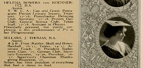 1920 Helena Bowers Von Koenneritz earned an MA, Relational Between the Maximum Diffraction Angle and the Radius of Curvature of the Diffracting Edge. In 1922, Helena earned a Master of Journalism from UT. In above photo we see Thelma Wright (bottom row, second from left and Helena Von Koenneritz, bottom row, third from right). Helena is also shown at right.