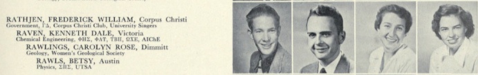 Above is group picture of the Newman Club in 1921, Emma is second from right on front row. She married Charles Frederick Wiebusch (1903–99) from Riesel in 1925 or 1926. He was a tutor in the physics department and graduated in 1924. His picture from 1924 Cactus is at right. He was a very successful research engineer at Bell Telephone. Emma and Charles established endowments in UT College of Engineering.