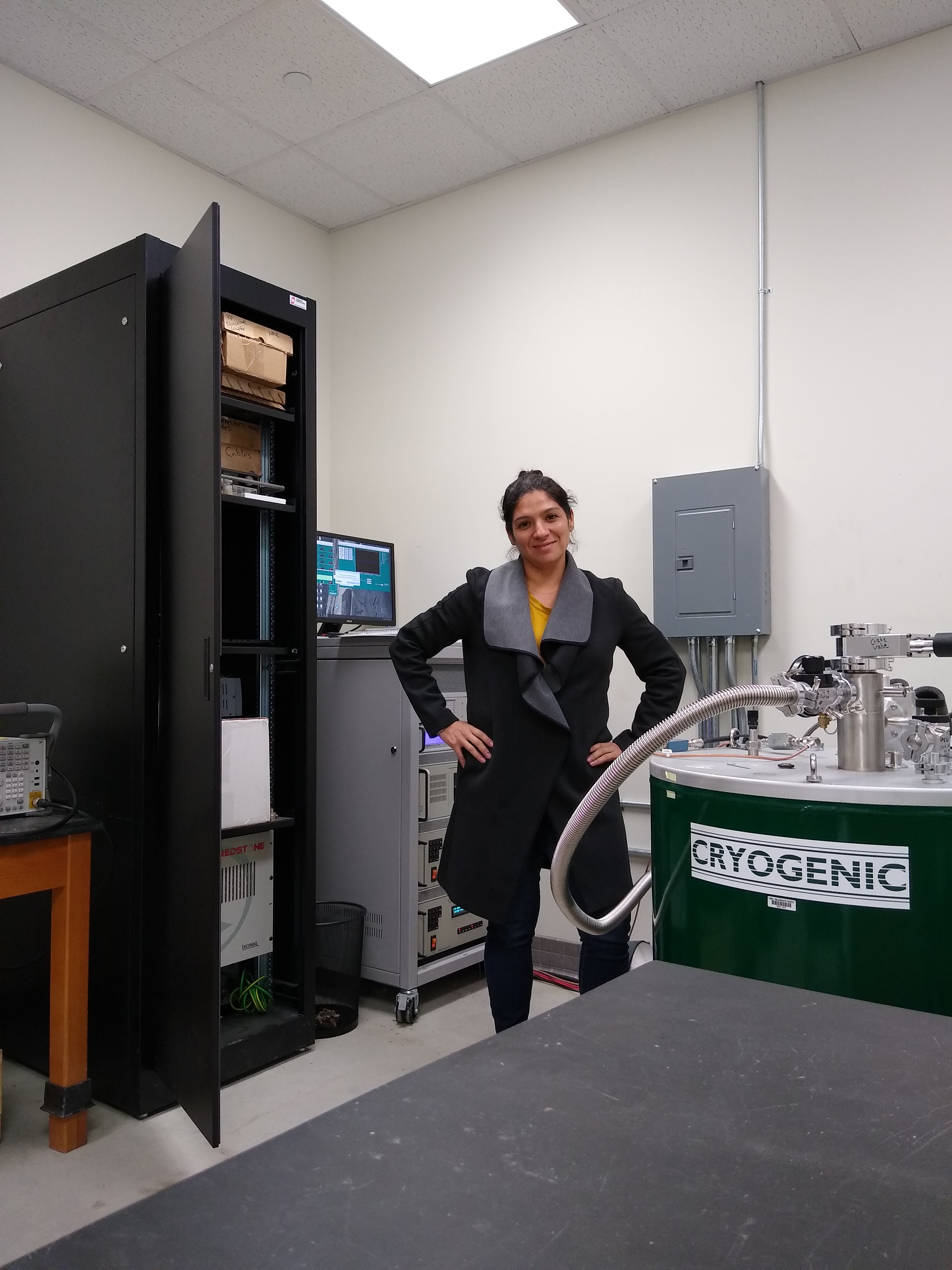 2011 Rosa Elia Cardenas (1980-) Rosa Elia Cardenas earned an MA in 2005 and her PhD in 2011. Her dissertaion was entitled, " Analysis of Crystalline Ammonium Hexafluorophosphate Using Nuclear Magnetic Resonance Force Microscopy (NMRFM) and Design and Construction of a Dynamical Room-temperature NMRFM Microscope". Her supervisor was Professor John Markert. Rosa was born in Houston, TX. She is the youngest of four siblings. After graduating from Business Careers High School in San Antonio, TX, she attended The University of Texas at Austin. After two years at UT, she was awarded the Corporate Sponsored Scholarship from The American Physical Society, and the Gates Millennium Scholars scholarship award from the Bill and Melinda Gates Foundation. In her third year at UT, she began working in Dr. Markert’s Magnetism and Superconductivity Lab. In her last year she worked with Soyeun Park in Dr. Josef Kas’ Biophysics Lab. After graduating with a Bachelor of Science degree in physics from The University of Texas at Austin, she worked for a company in California. While working, she applied to graduate school and was accepted. She began her graduate work at The University of Texas at Austin, and re-joined Dr. Markert’s Magnetism and Superconductivity Lab. Two years later, she graduated from The University of Texas at Austin with a Master of Arts degree in physics. She then continued as a PhD student to pursue the study of solid state crystalline samples using Nuclear Magnetic Resonance Force Microscopy. In one summer, she was awarded an internship at Sematech where she worked for Dr. Joseph Bennett using secondary ion mass spectrometry (SIMS) in the analysis of semiconductor devices. She is graduating with her Ph.D. in physics in August of 2011. After graduation she had aa postdoctoral position at Sandia National Lab in Livermore, California. She is currently on the faculty of the University of Incarnate Word in San Antonio, Texas.
