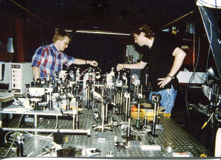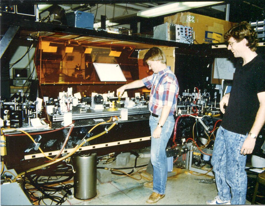 Details of above photo Michael and Monty working on a femtosecond laser amplifier located in RLM 2.408. Downer writes, "He was my 3rd PhD students (out of more than 40 total). The picture dates from 1988. This was our first-generation femtosecond laser, based on liquid fluorescing dyes. The red-ish tubes visible in the photo contain the flowing dye. The laser is not operating in the photo, hence the absence of laser goggles. This system produced laser pulses with a whopping 30 gigawatts (GW) peak power, and was used to study ionization physics. Now a system based on solid-state gain media has replaced it, and produces pulses of 30 terawatts (TW) peak power, and is used to study laser-plasma particle acceleration. Monty went on to become a staff scientist at Los Alamos NM.
